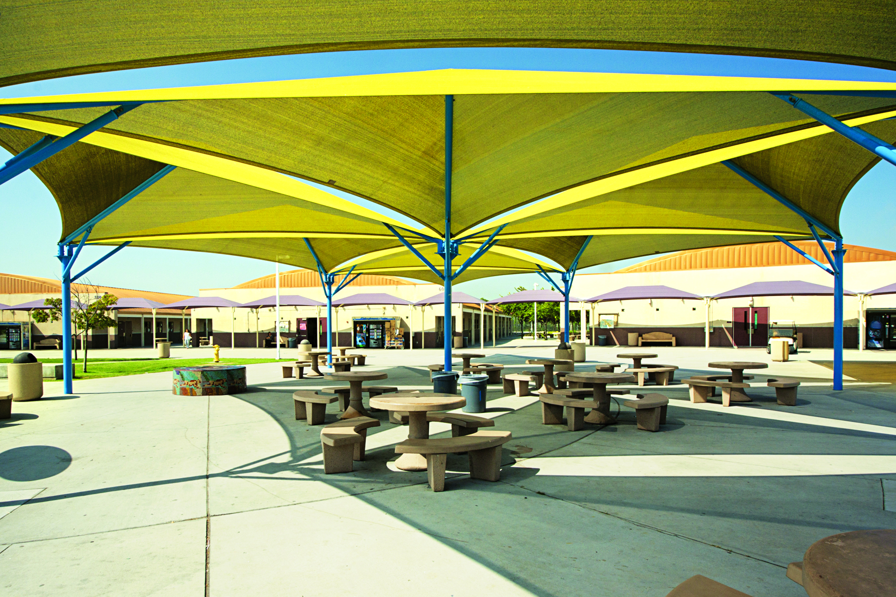 Triangle shade structures unite geometry and practicality. With three columns and a peaked roofline, they’re perfect for irregular or elongated spaces, providing both aesthetics and shelter. These versatile structures enhance any environment with their unique design, offering stylish shade solutions for various settings.
