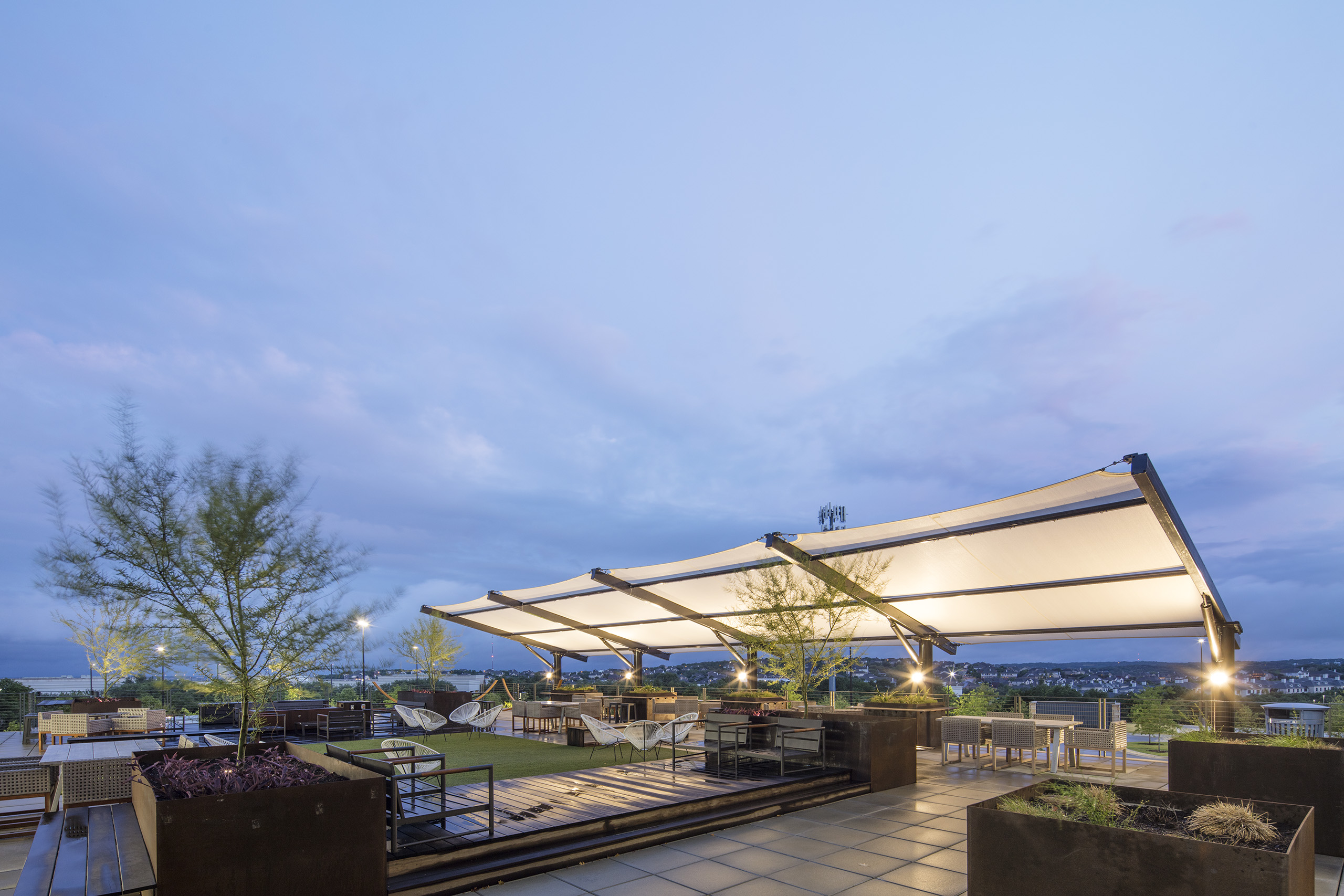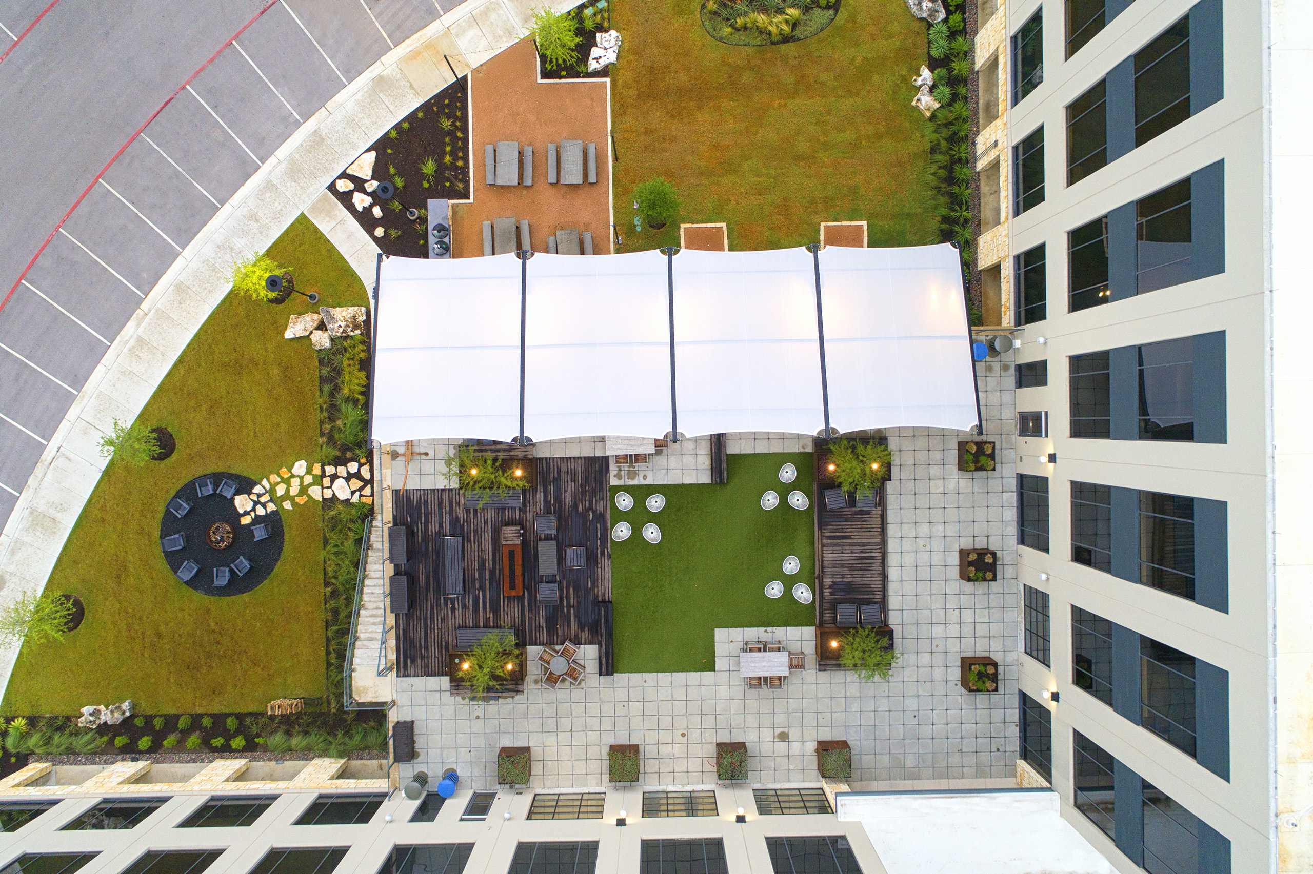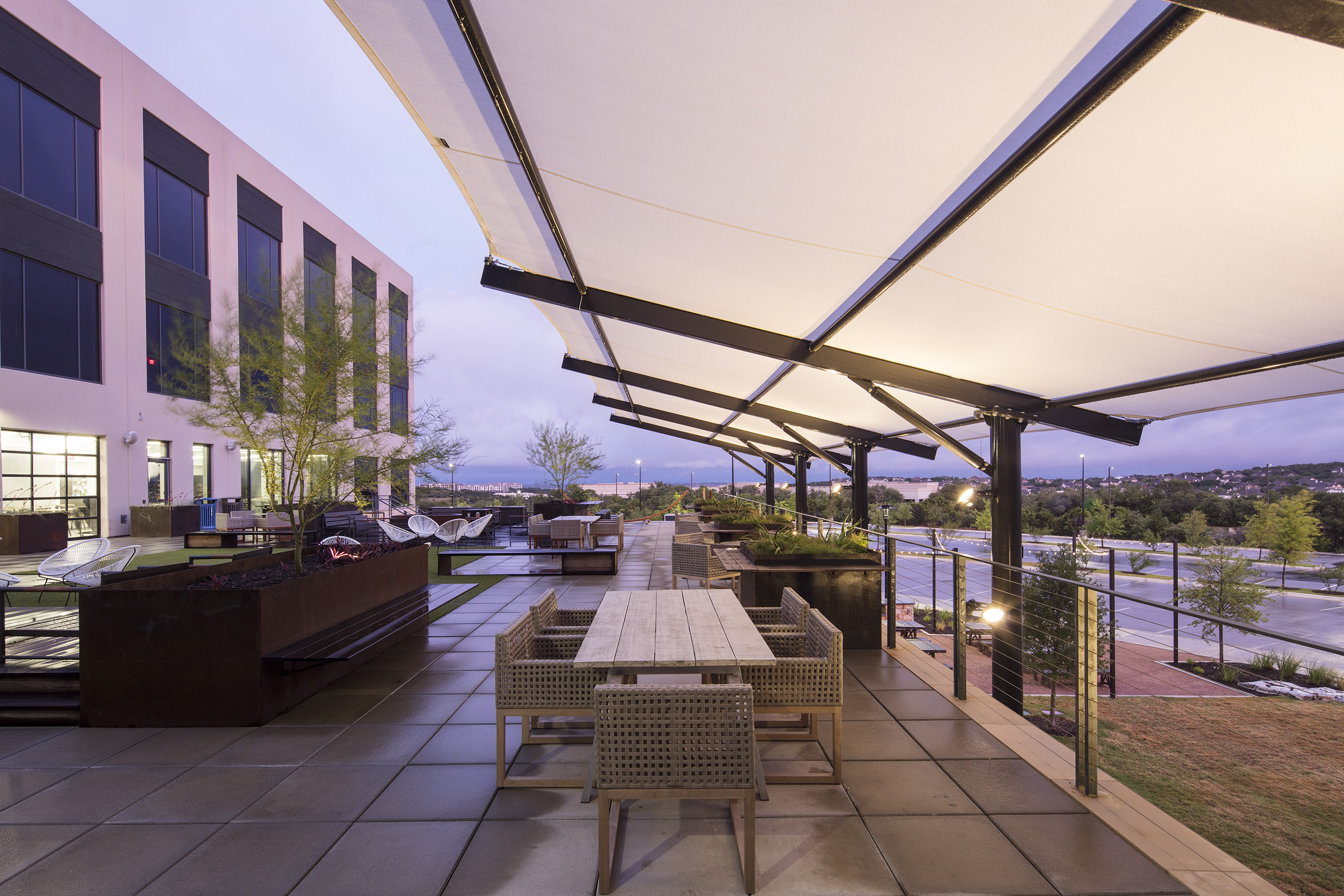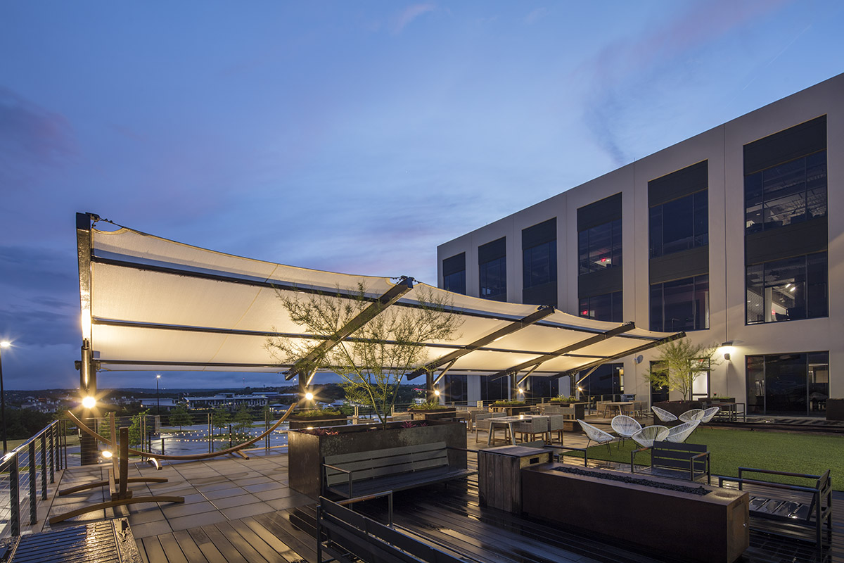 Makers of today’s leading premium coolers and drinkware, the YETI company contracted a USA SHADE distributor to provide shade for a unique area at their Austin, TX campus. This rooftop location had been home to various YETI corporate events, yet wasn’t being utilized consistently during the hottest months of the year. USA SHADE and the distributor worked with YETI to design, manufacture and install a unique slanted Canti Wing structure (25′ x 75′) in late 2017 that shades multiple seating areas, so now they can comfortably host events in this space year-round.