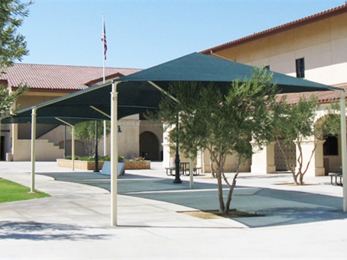 This college in Palm Desert, California utilizes our Joined Hip structures for a walkway. The green fabric and beige steel structure measures 20' x 30' x 10.' The "workhorse” of our product line, Hip structures are ideal for shading a wide variety of areas. Its roof design features clean, straight lines which is a common look for surrounding buildings and structures.