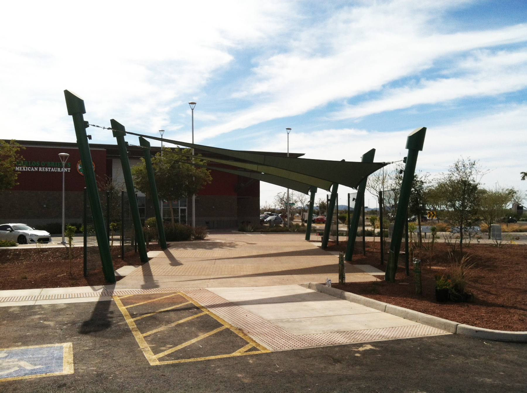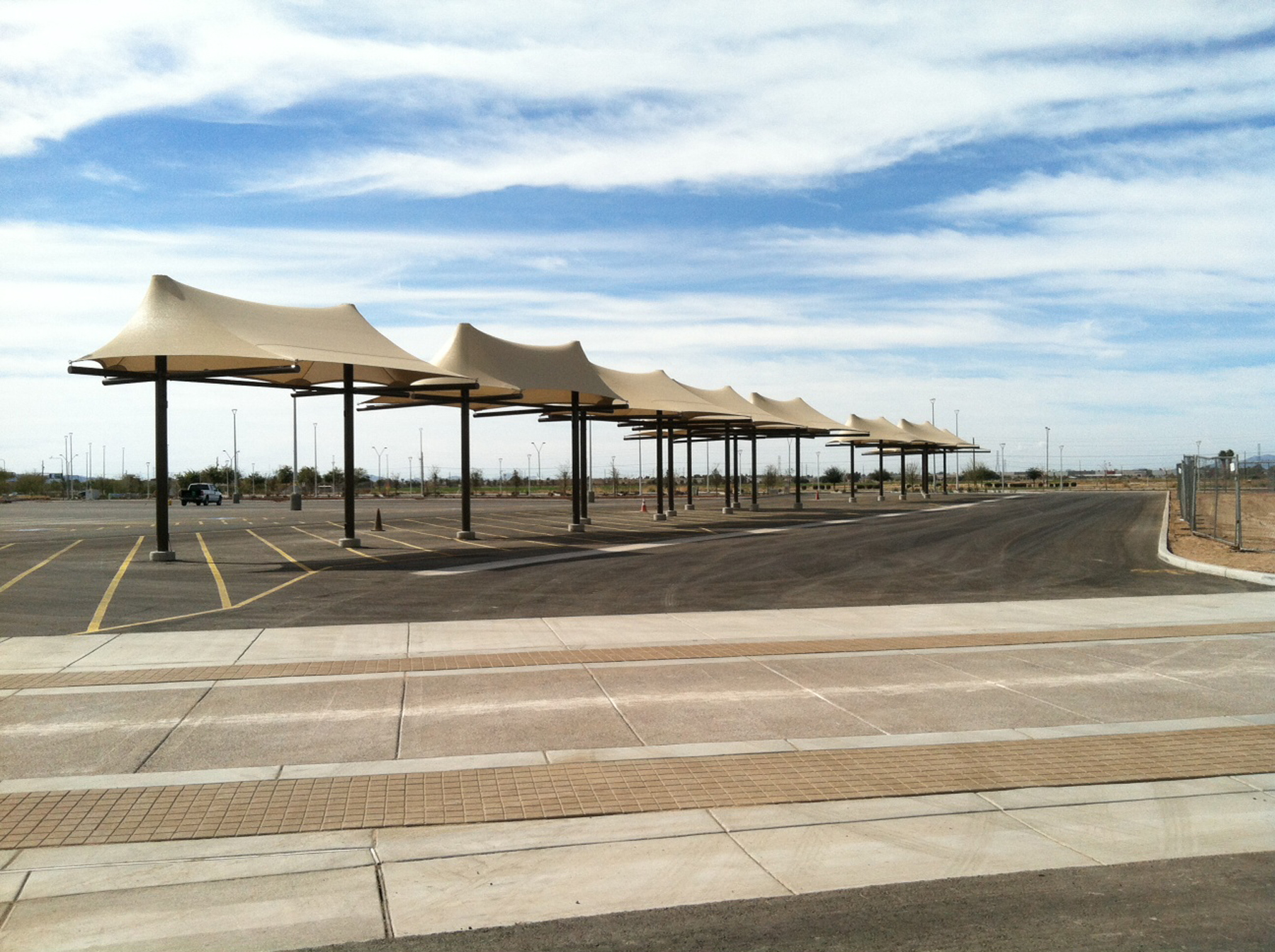 Commuters awaiting the next bus in this Central Arizona community can do so protected from the sun. USA SHADE designed and erected ten of these dual-mast sail structures as a customer amenity, with each structure providing over 550 square feet of shade. In the walkway, 3-Point Sails were also added.