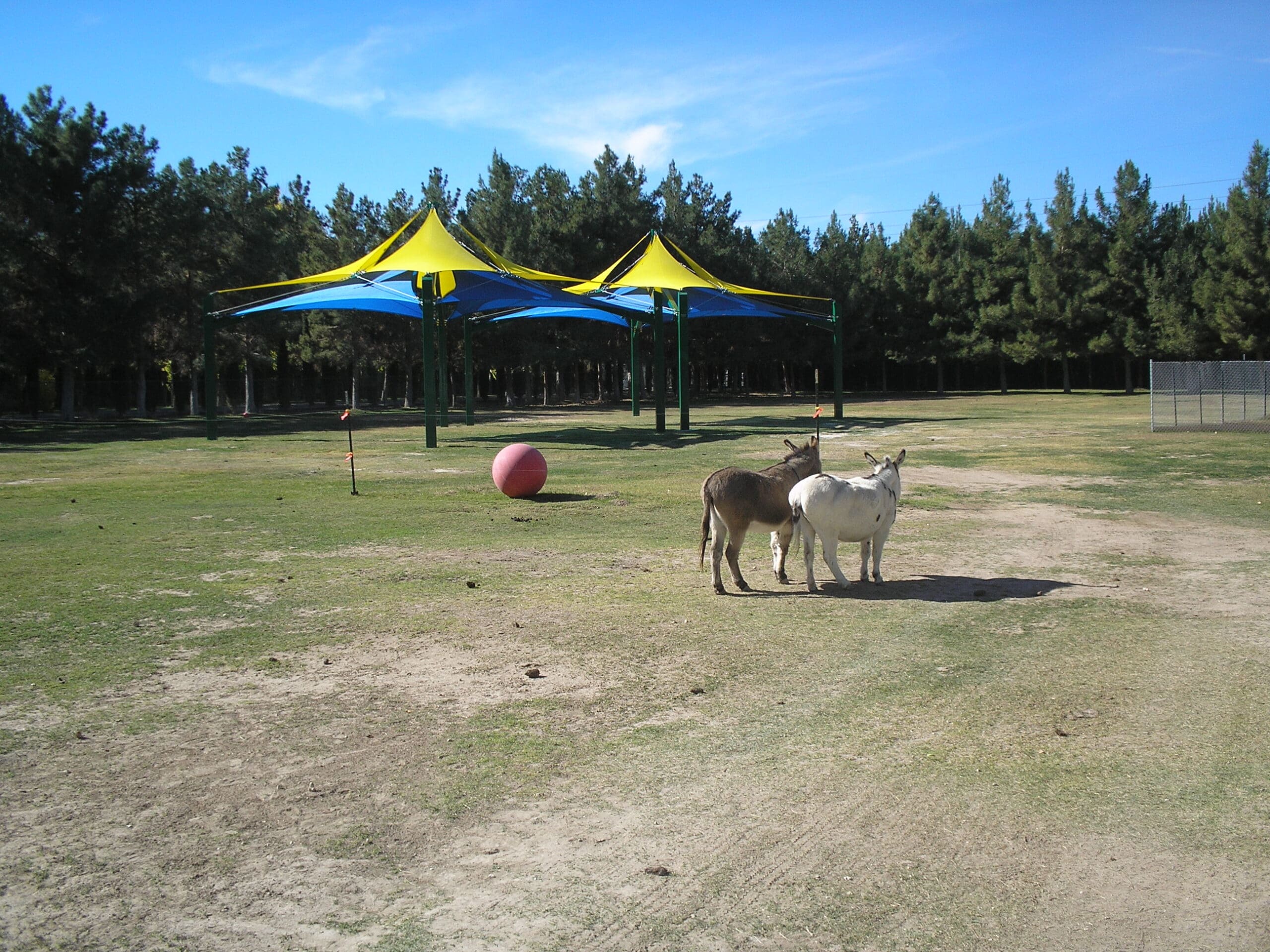 This sprawling estate in Southern Nevada features a sizable animal sanctuary that was in desperate need of shade for its inhabitants. Rather than selecting a more simple design such as our Hip structure, this client chose a more visually appealing look with our Super Span Pyramid Multi-Level Multi-Panel. All three structures combined provide over 3,800 square feet of shade for horses, mini-donkeys, royal turkeys, and more.