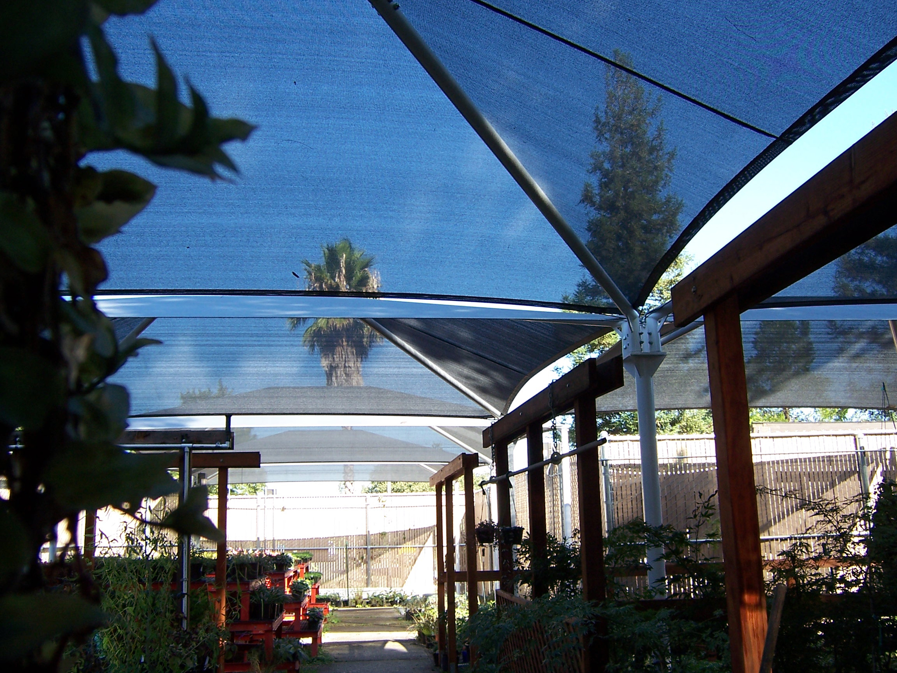 Positioned over the horticulture center nursery at this Central California college, these joined Hip structures not only protect students and faculty from the sun, but also the plants and vegetation within the nursery. Thanks to it's knitted design, our HDPE mesh fabrics allow rising warm air to escape, providing improved air circulation over traditional roofing systems.