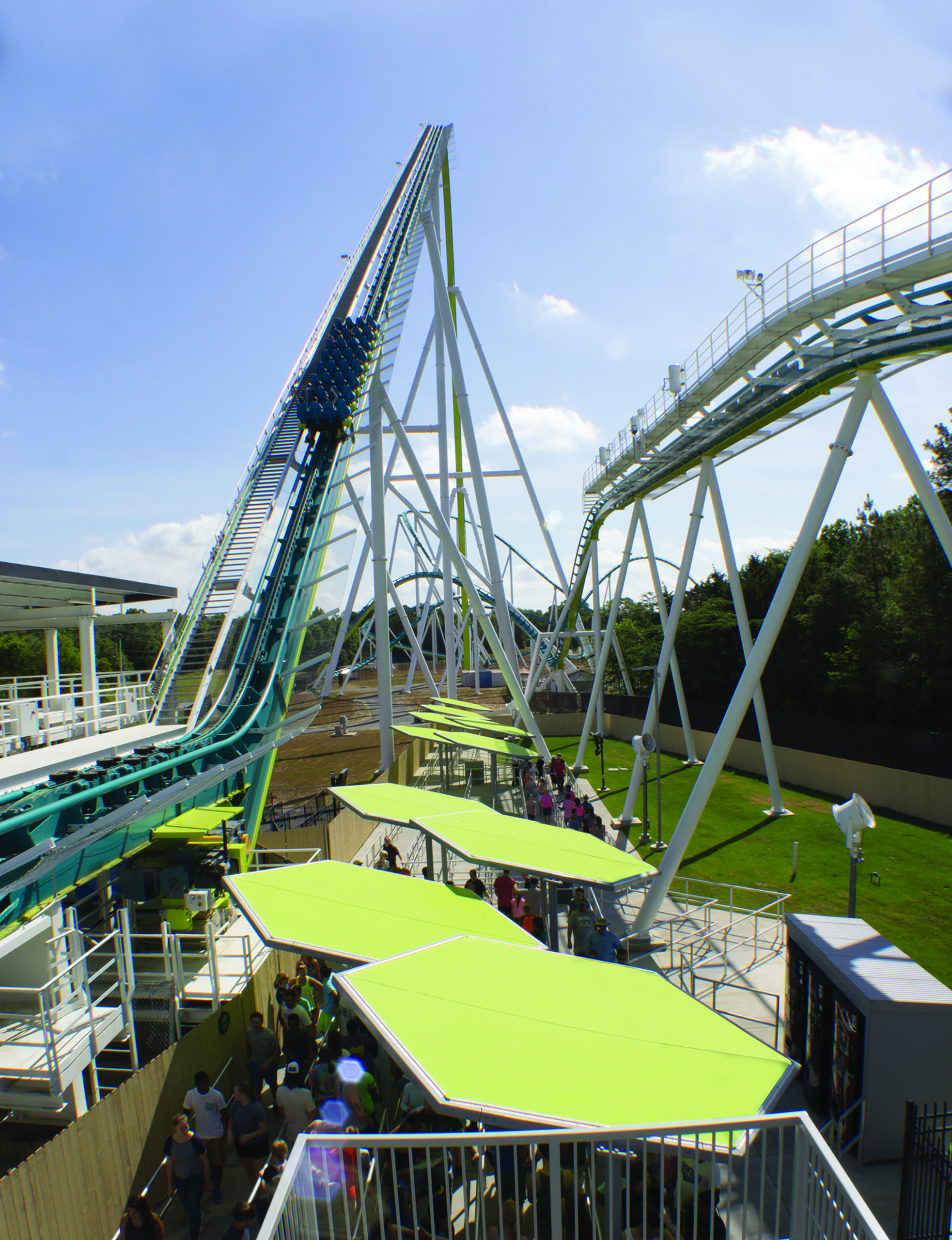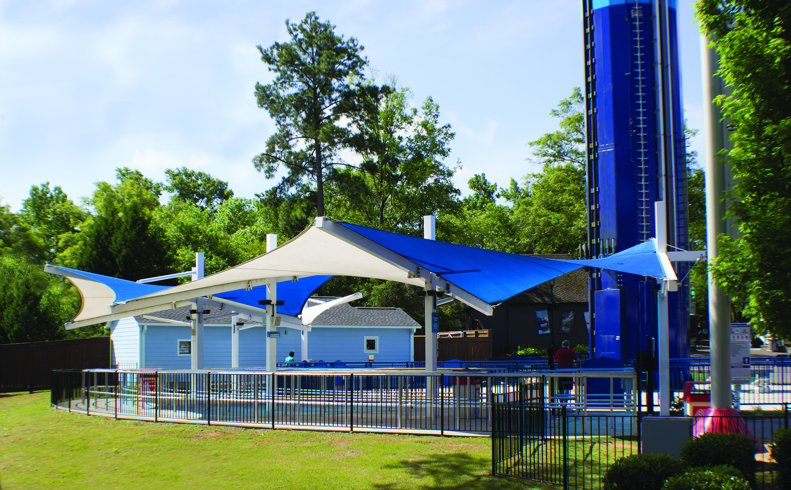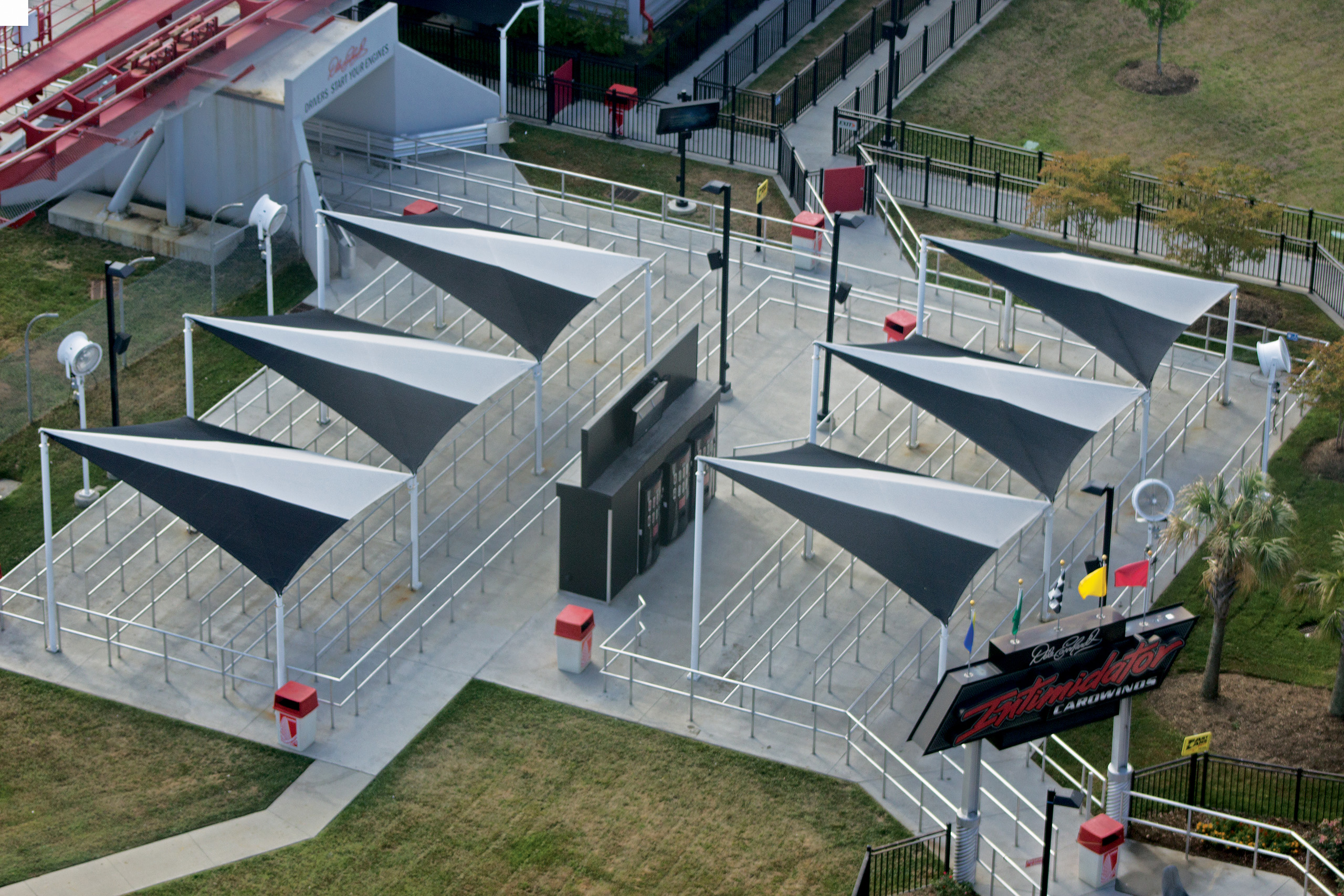 Protecting rollercoaster enthusiasts from the harsh sun, these custom structures shade the queue line at Carowinds' Fury 325, one of the world's fastest coasters. The fabric color was selected to match part of the Fury's branding.
