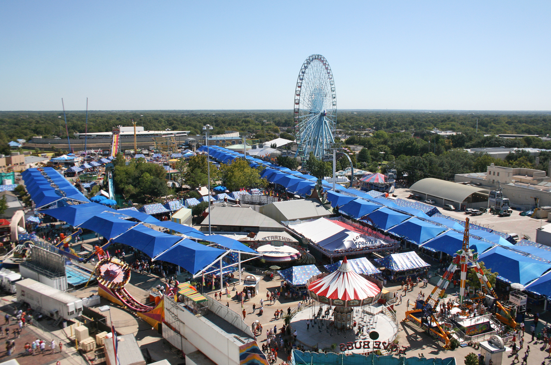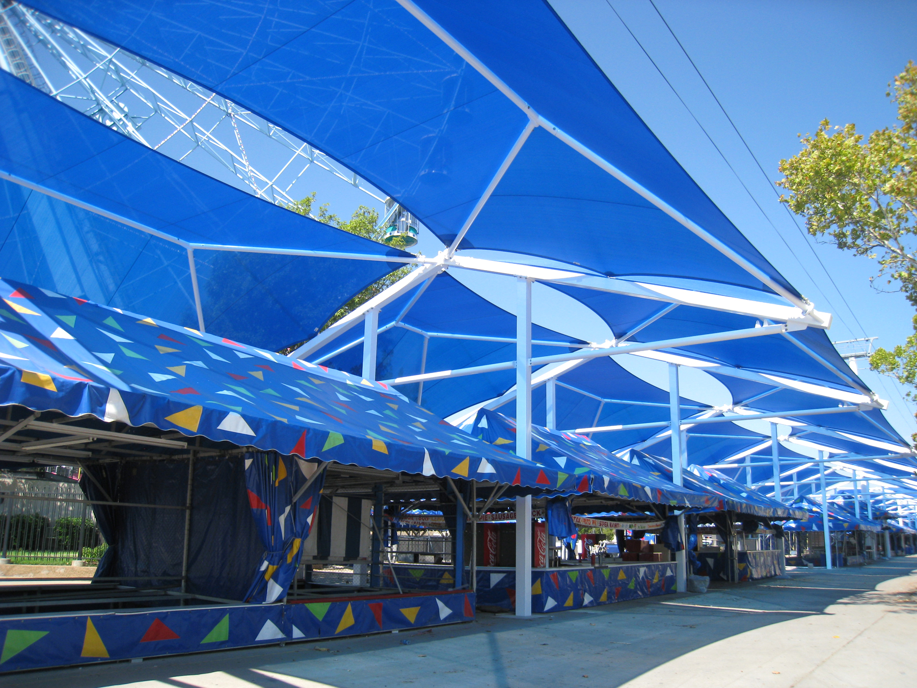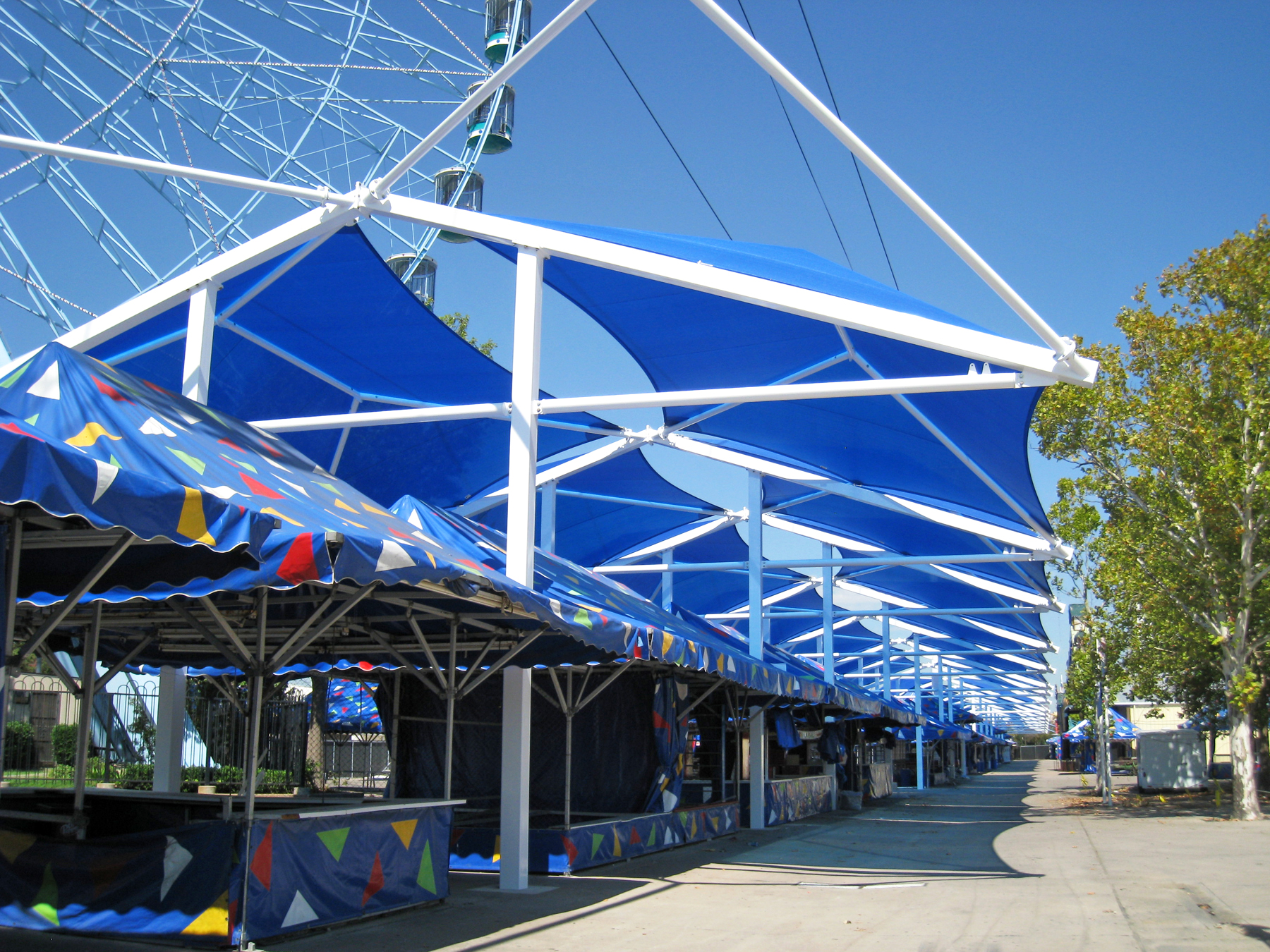 One of the largest events in Texas, the State Fair is attended by over two million people each year. Fairgoer's walking along the midway are protected from the sun's harmful UV rays by our custom cantilevered shade structures. With average daytime temperatures hovering around 90 degrees during the fair, shade is a welcomed amenity.