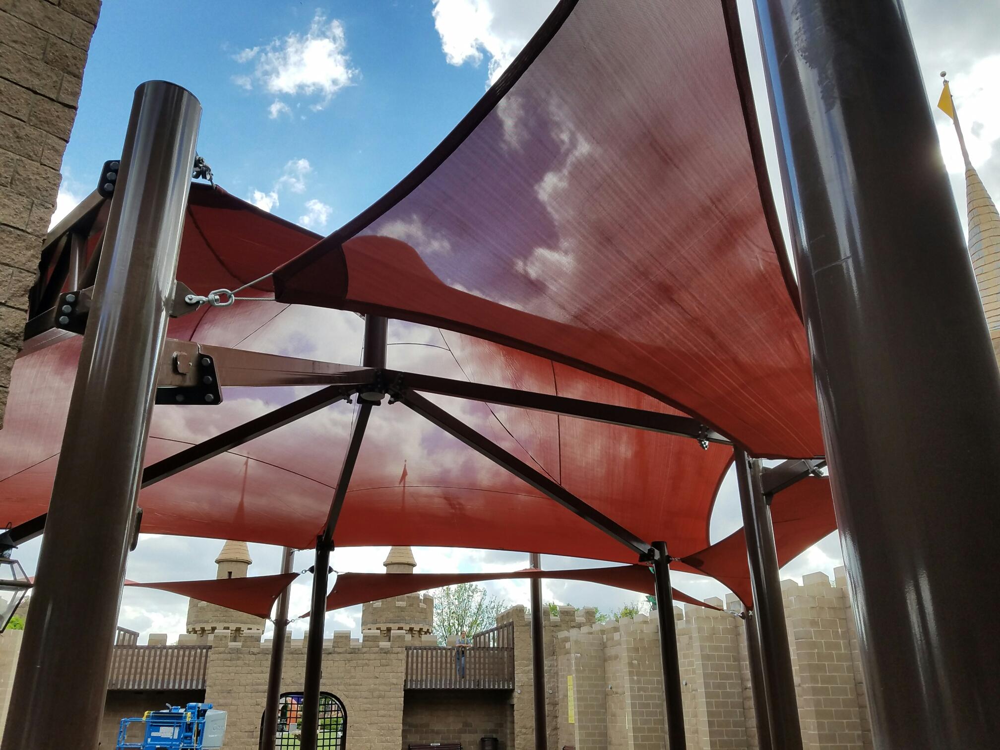 One of the more unique projects we've done, this custom structure features two 4-Point Sails, as well as a large multi-point Sail atop a cone mast. These structures provide shade over the audience bleachers at this South Dakota theme park's performance stage.