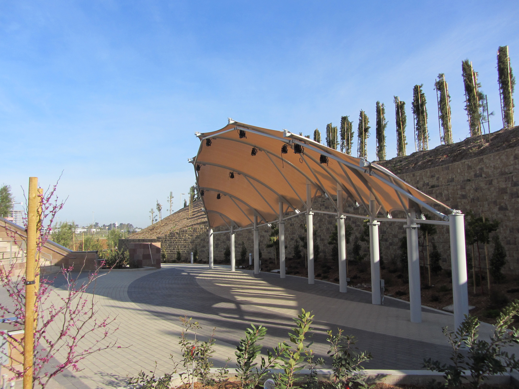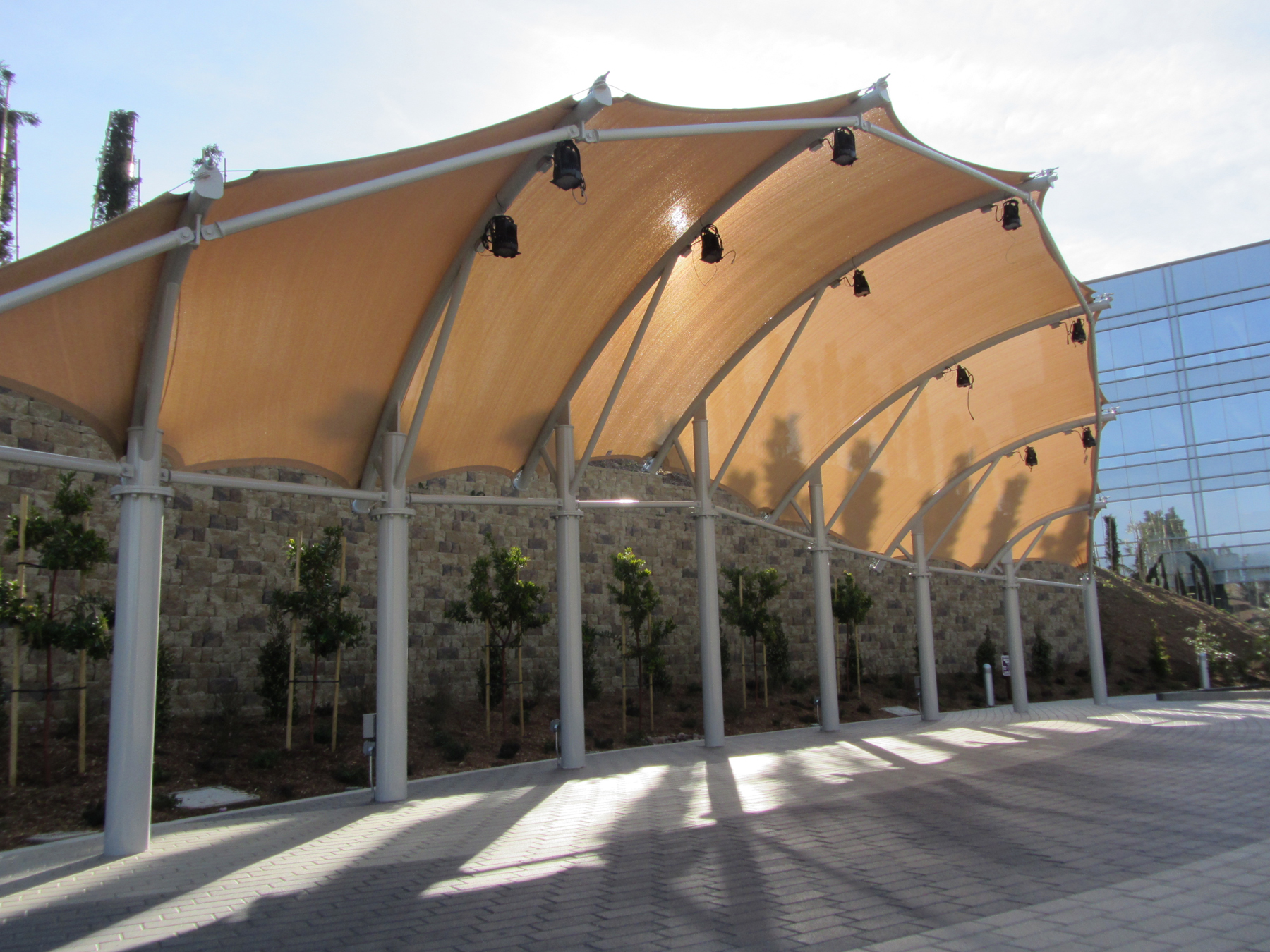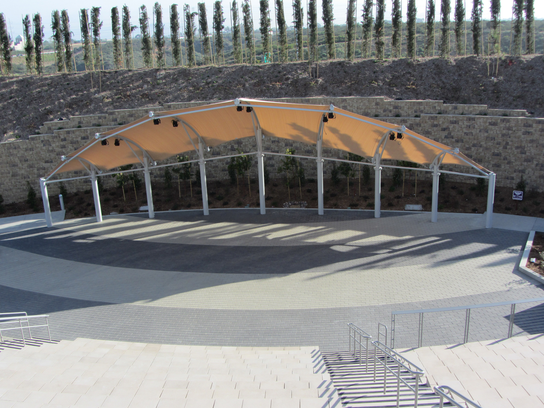 Fabric structures can provide just the right artistic touch such as with this 74’ x 20’ custom bandshell structure in San Diego. Let our designers and engineers assist you with a custom shade structure that conforms to your exact requirements. We’ll create a shade solution that will give your facility an innovative new look, and your company a competitive edge.