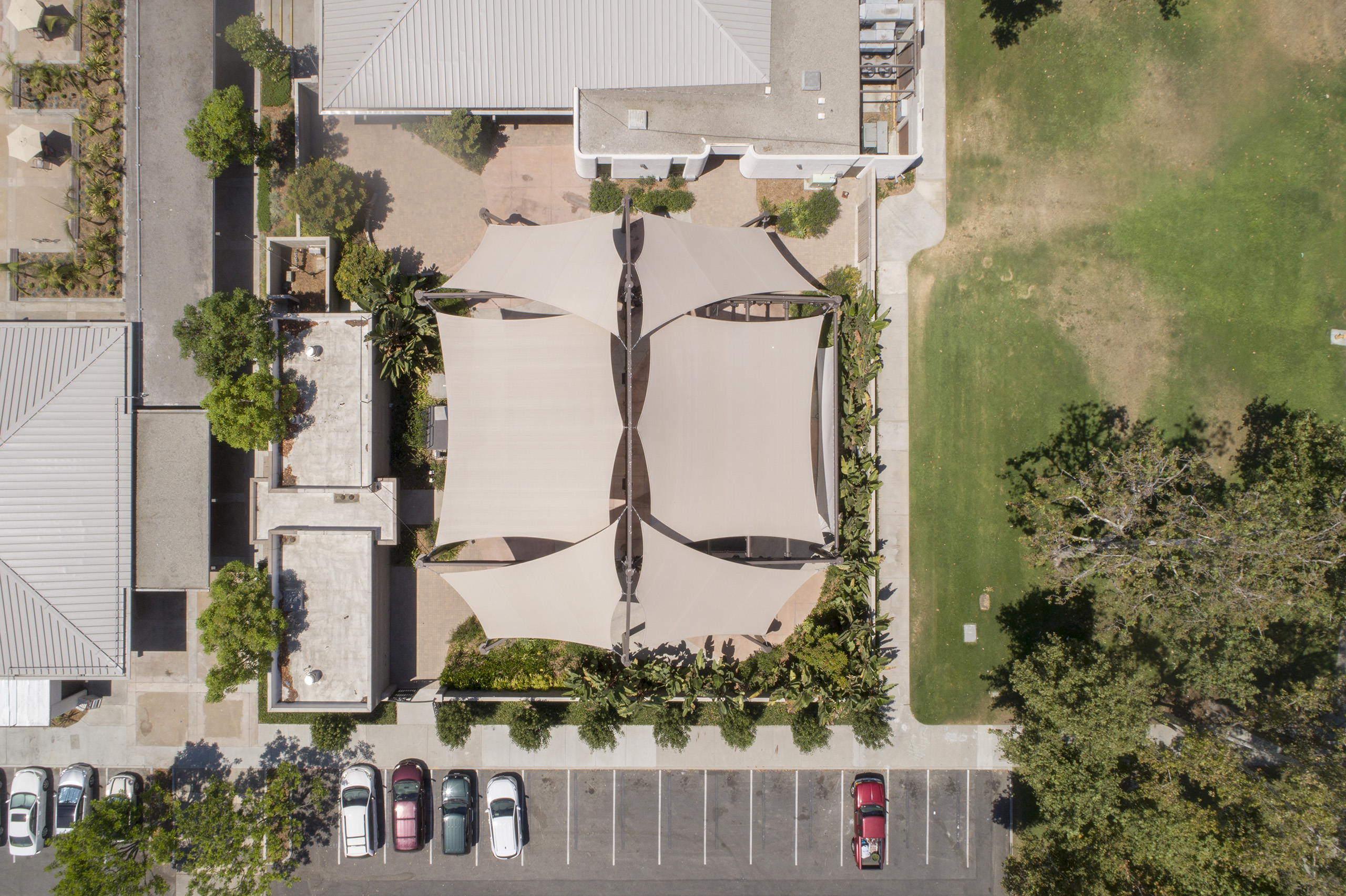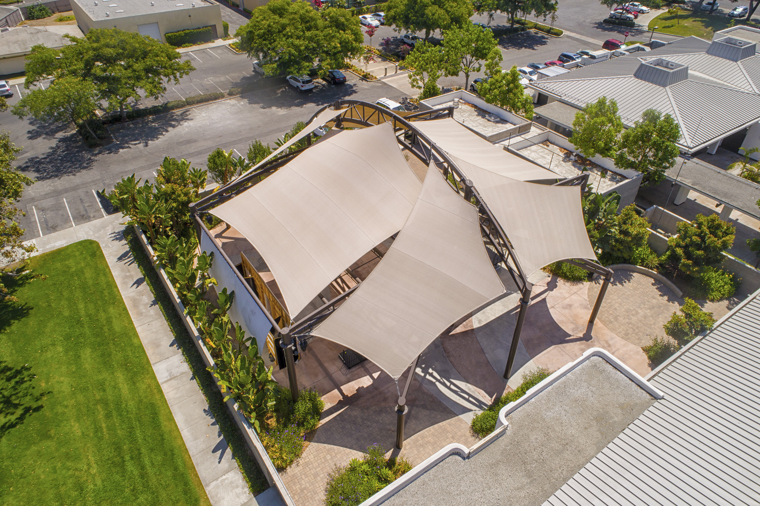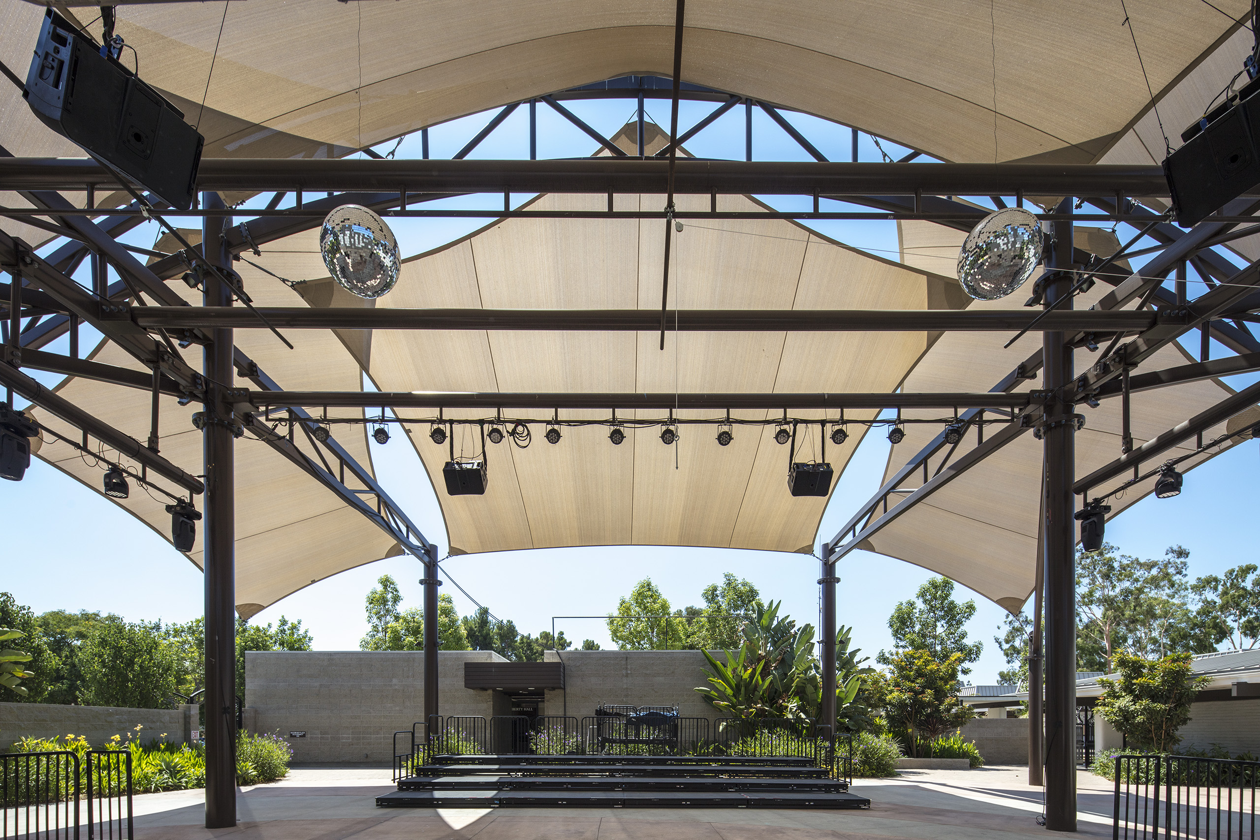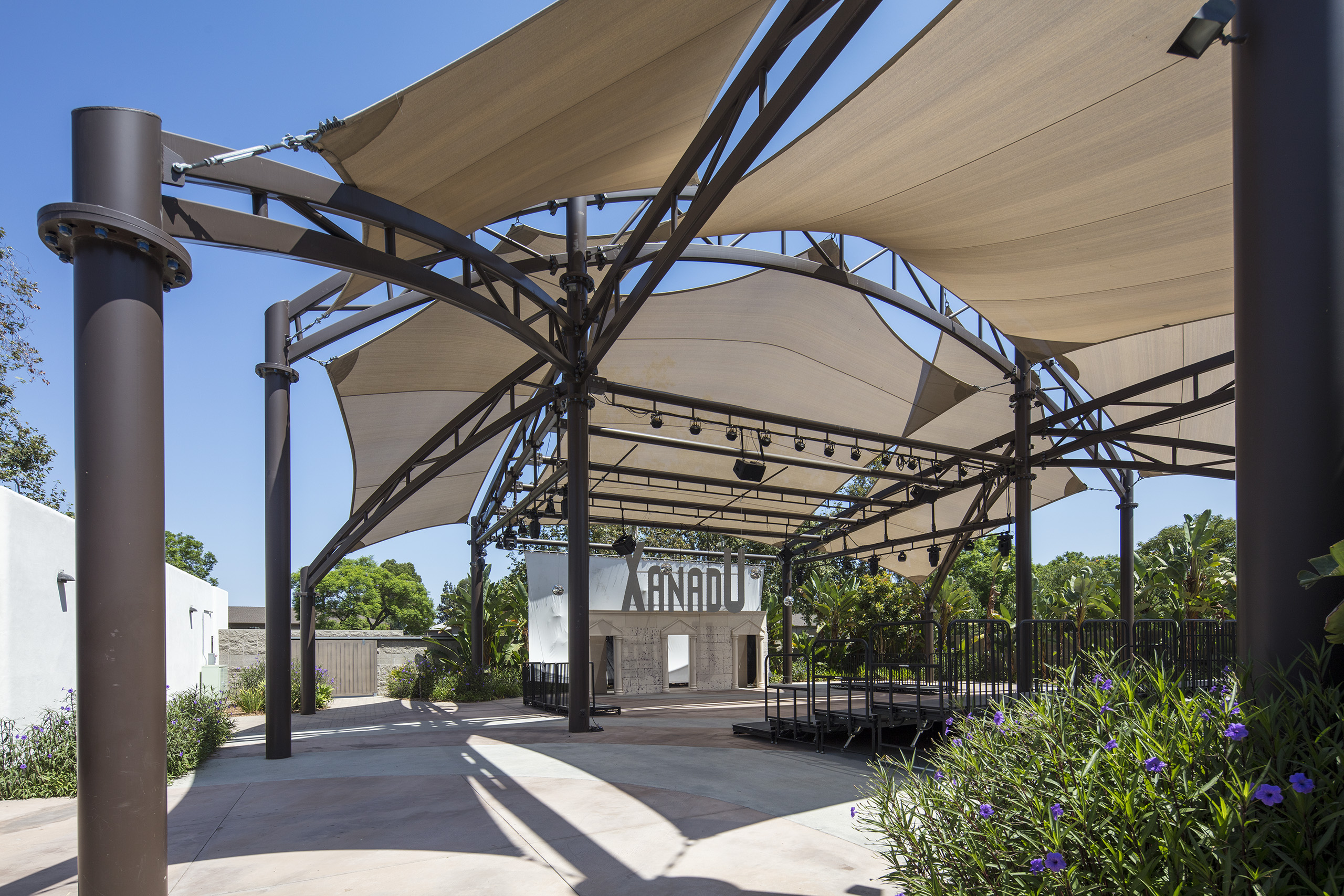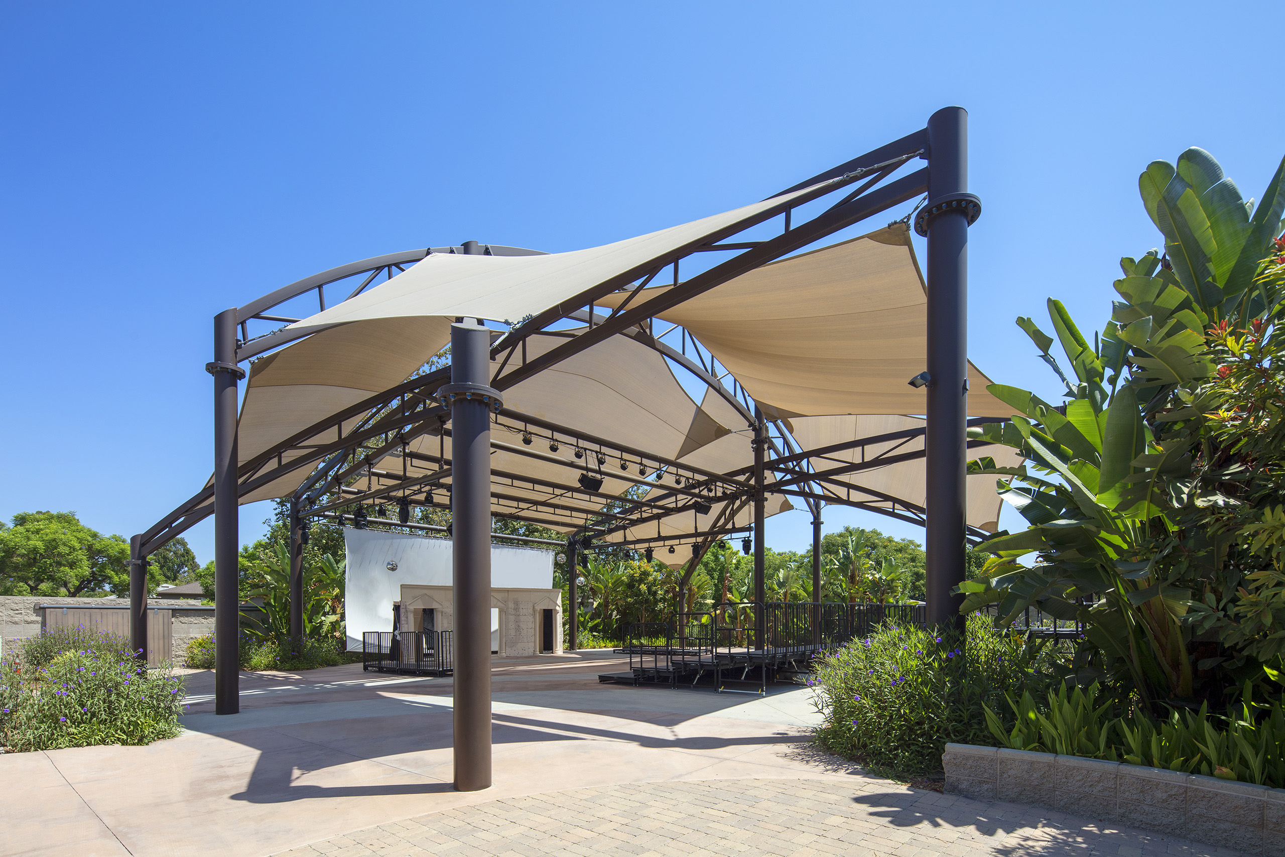 The City of Buena Park selected a unique structure to cover the outdoor multi-purpose space at their Ehlers Event Center. This 6,000 square foot custom structure features six 5-point tension sails that attach to a multi-truss steel structure. Our steel was fabricated to accept lighting and audio equipment, providing a fully functional entertainment and multipurpose space for the center.