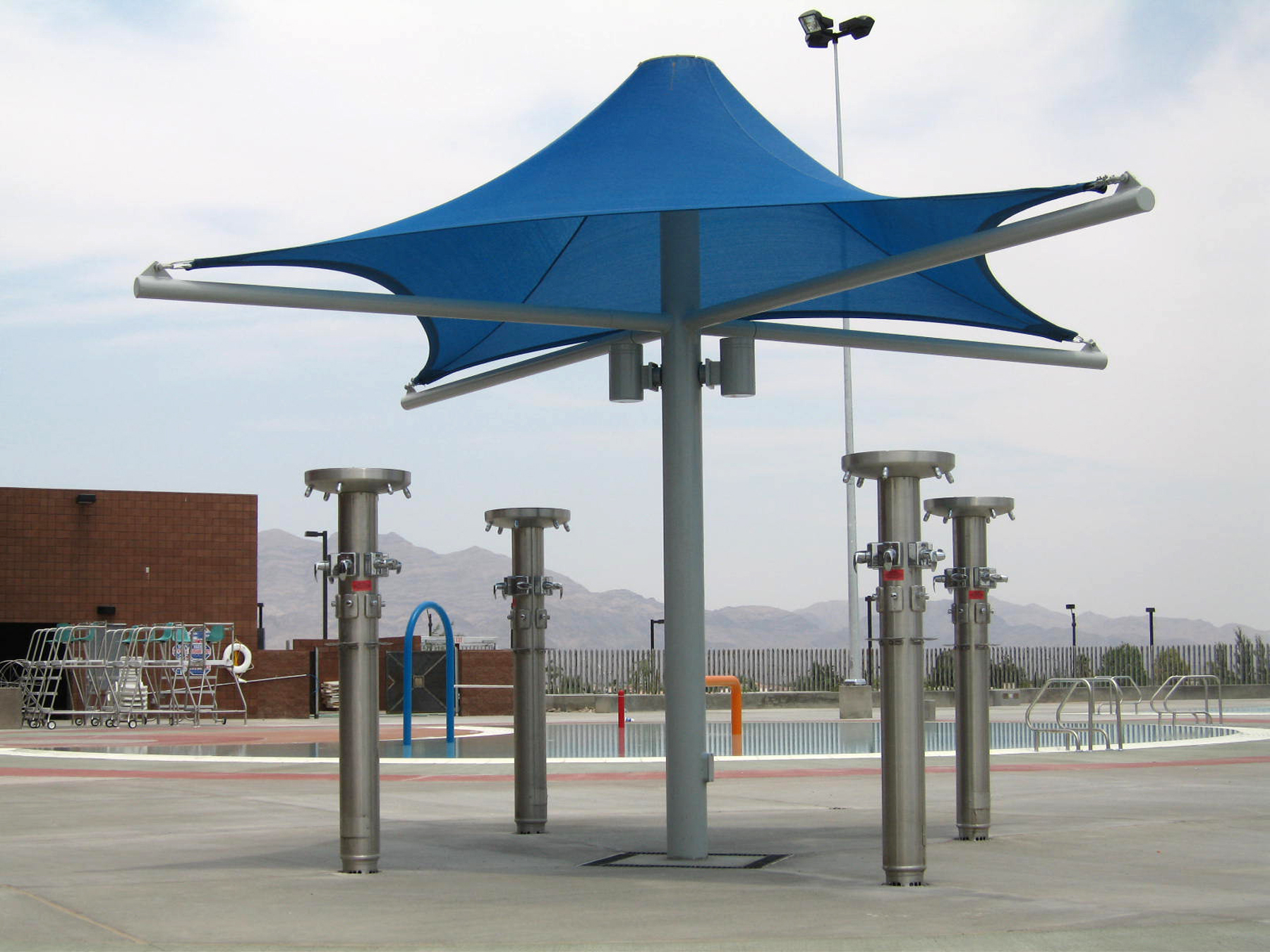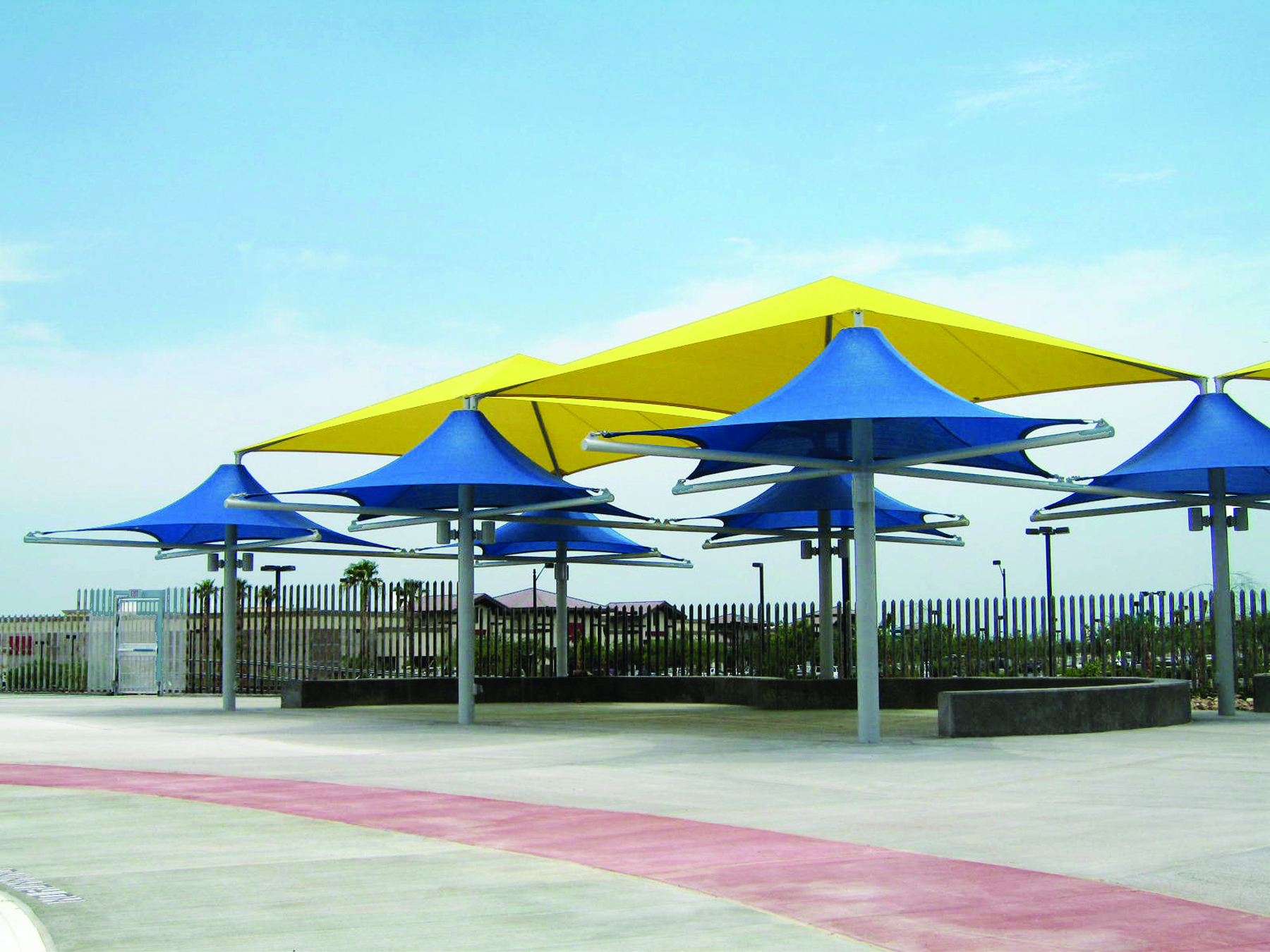 Butterfly structures provide a unique look for both community and theme park applications. Its wings can be fastened in Wings-Up, Wings-Flat, or Wings-Down formation, while the fabric panels can be sewn in a variety of colors. Like our Butterfly's, Flower structures provide unique aesthetics. Petal sizing can be customized to meet your exact shade requirements. The Twilite 4-Point structure features a single-column design with an elegantly shaped roof system.