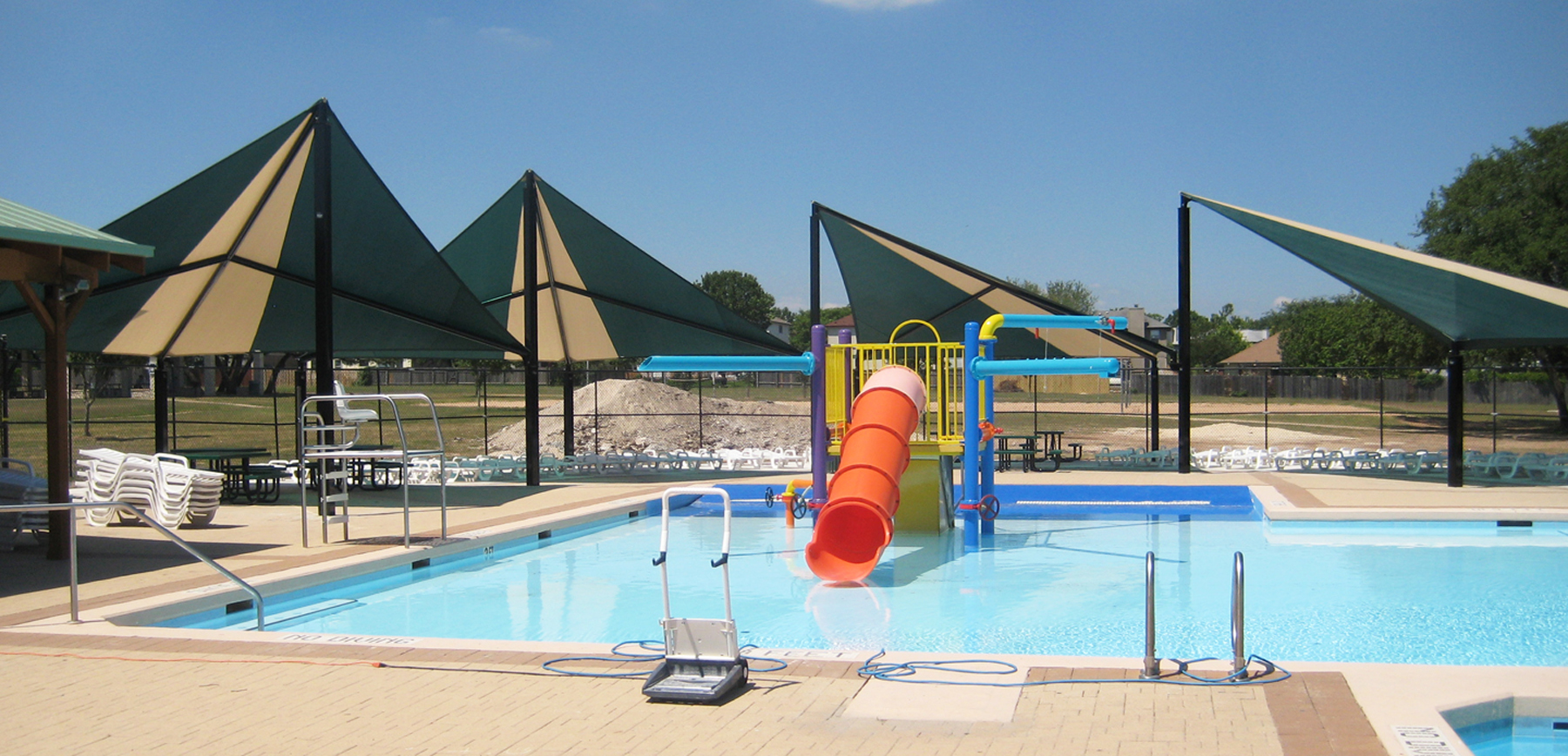 Hexagon structures are ideal for shading areas where our conventional solutions are not sufficient. Rounded patios and seating areas, as well as round (small) pools are often shaded with these six-post structures. Wave structures offer a unique look, adding excitement and color to any area. These structures are designed to represent a "wave", with peaks and valleys. Because of this shape, Wave structures are ideal for waterparks, poolsides, seating areas, and more.
