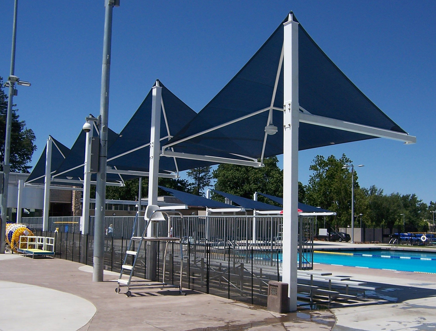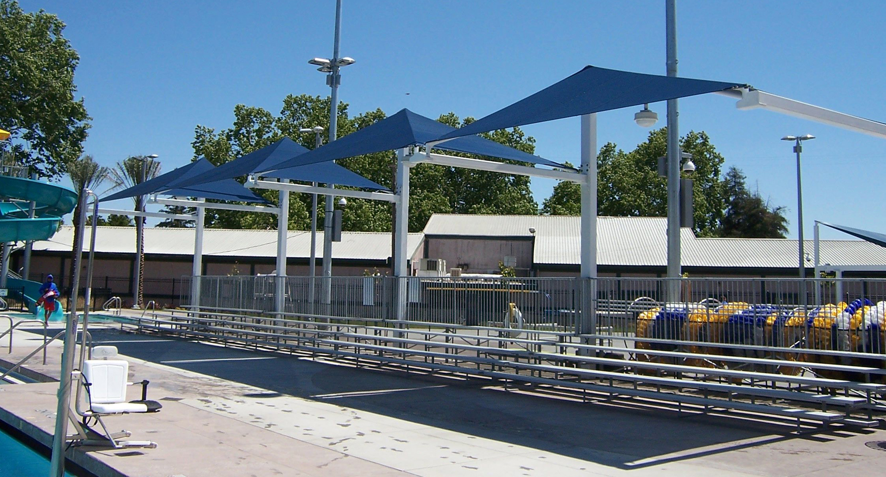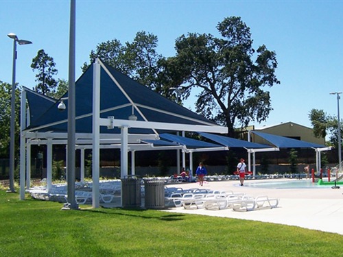 Swimmers at this Yuba City, California park pool area will stay cool with these stylish Joined Cantilever Wave structures covering the lounge chairs surrounding the pool. Our Wave structures offer a unique look while adding excitement and color to any area. These structures are designed to represent a “wave”, with peaks and valleys. Because of this shape, Wave structures are ideal for water parks, poolside, seating areas, and more.