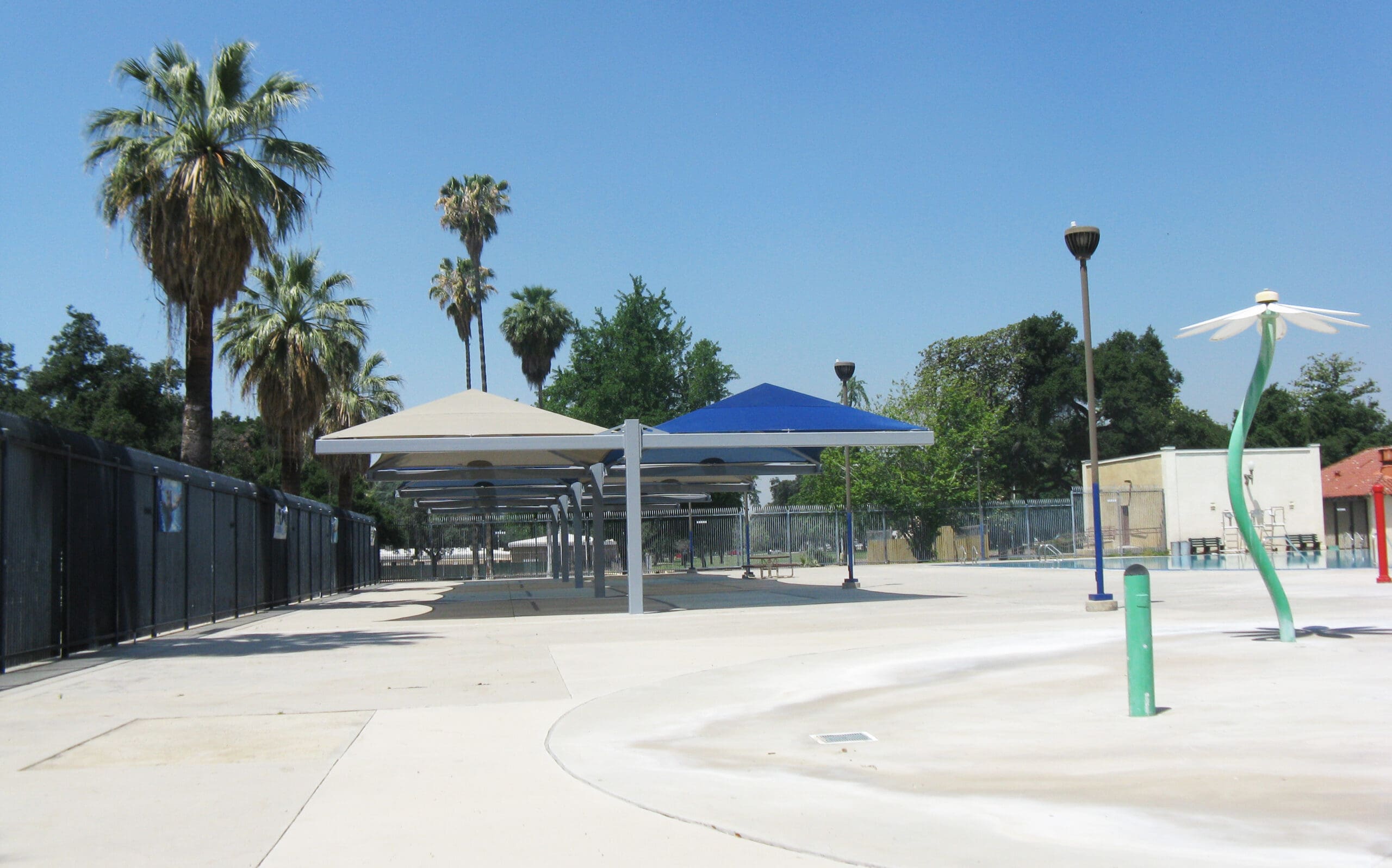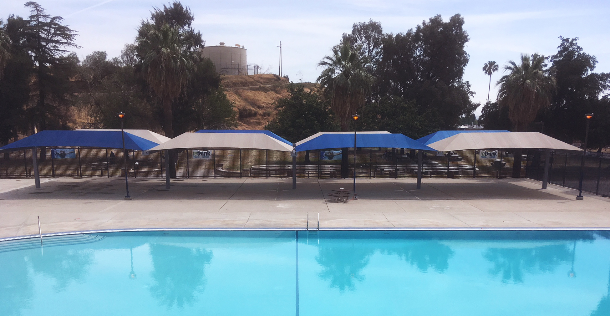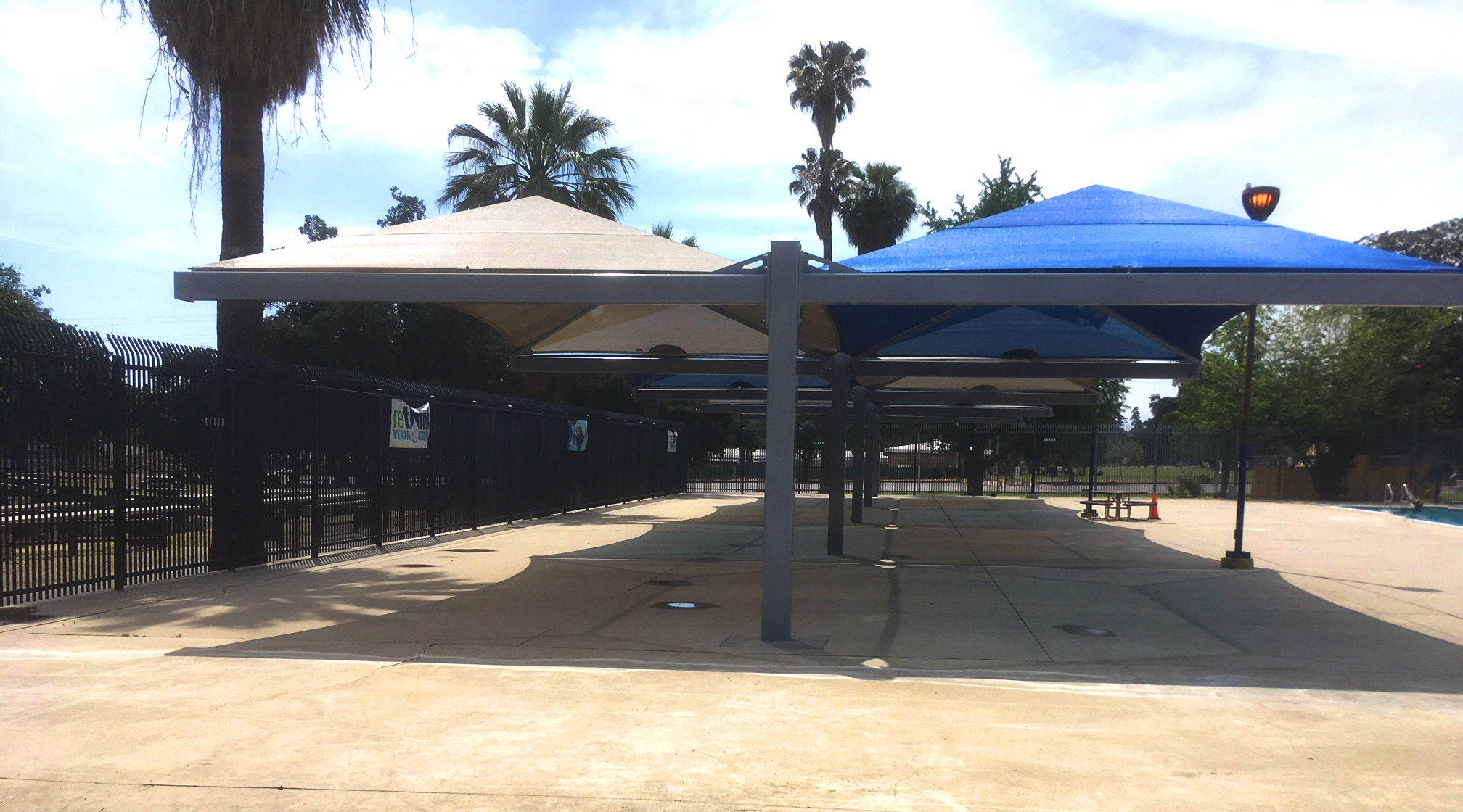 Covering over 4,800 square feet of poolside outdoor seating at this Southern California community swim center. USA SHADE installed a joined Full Hip Cantilever structure to provide plenty of shade, while utilizing alternating fabric colors for visual interest.