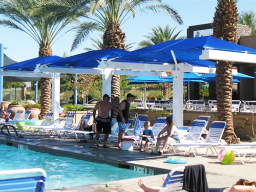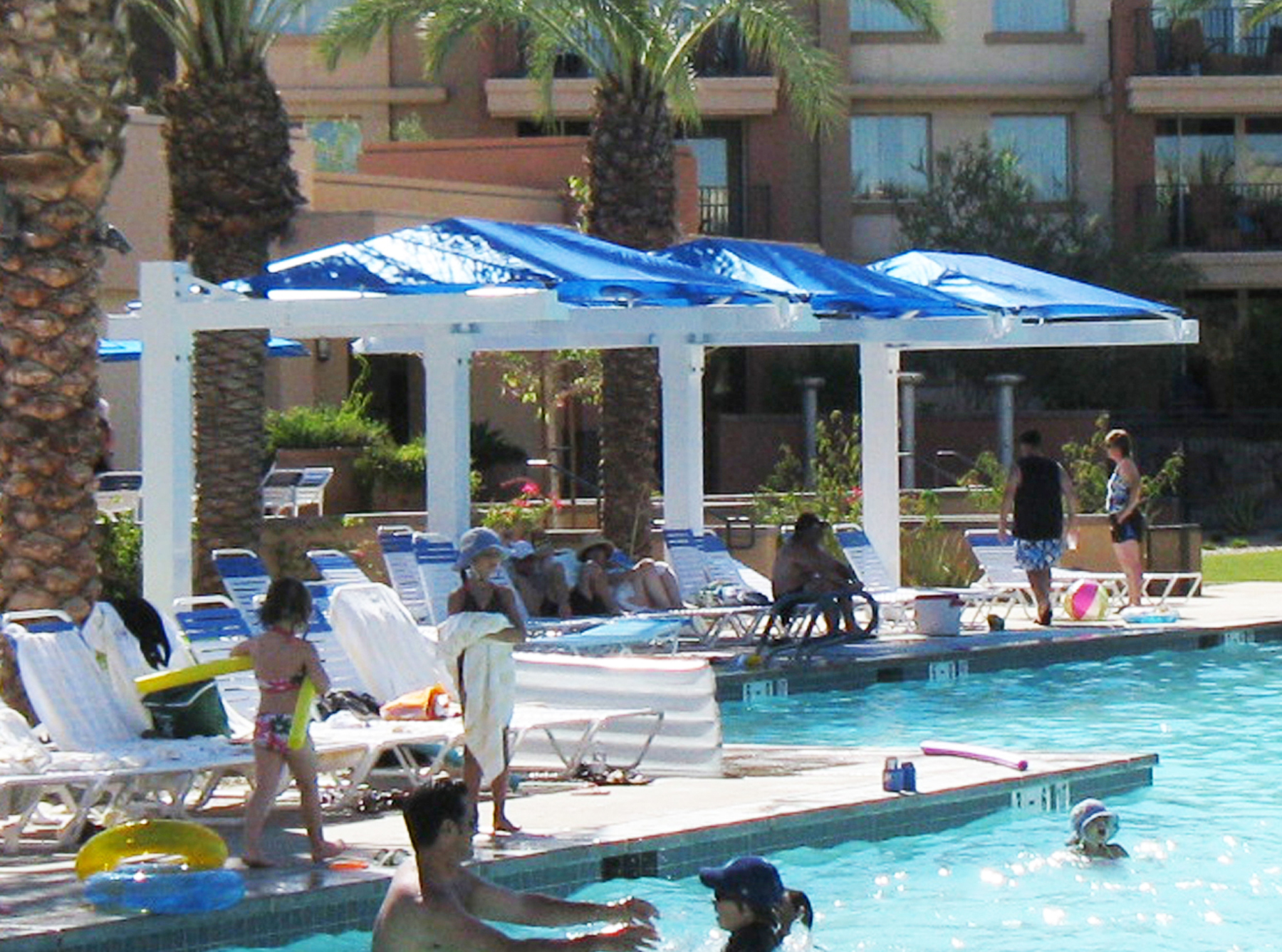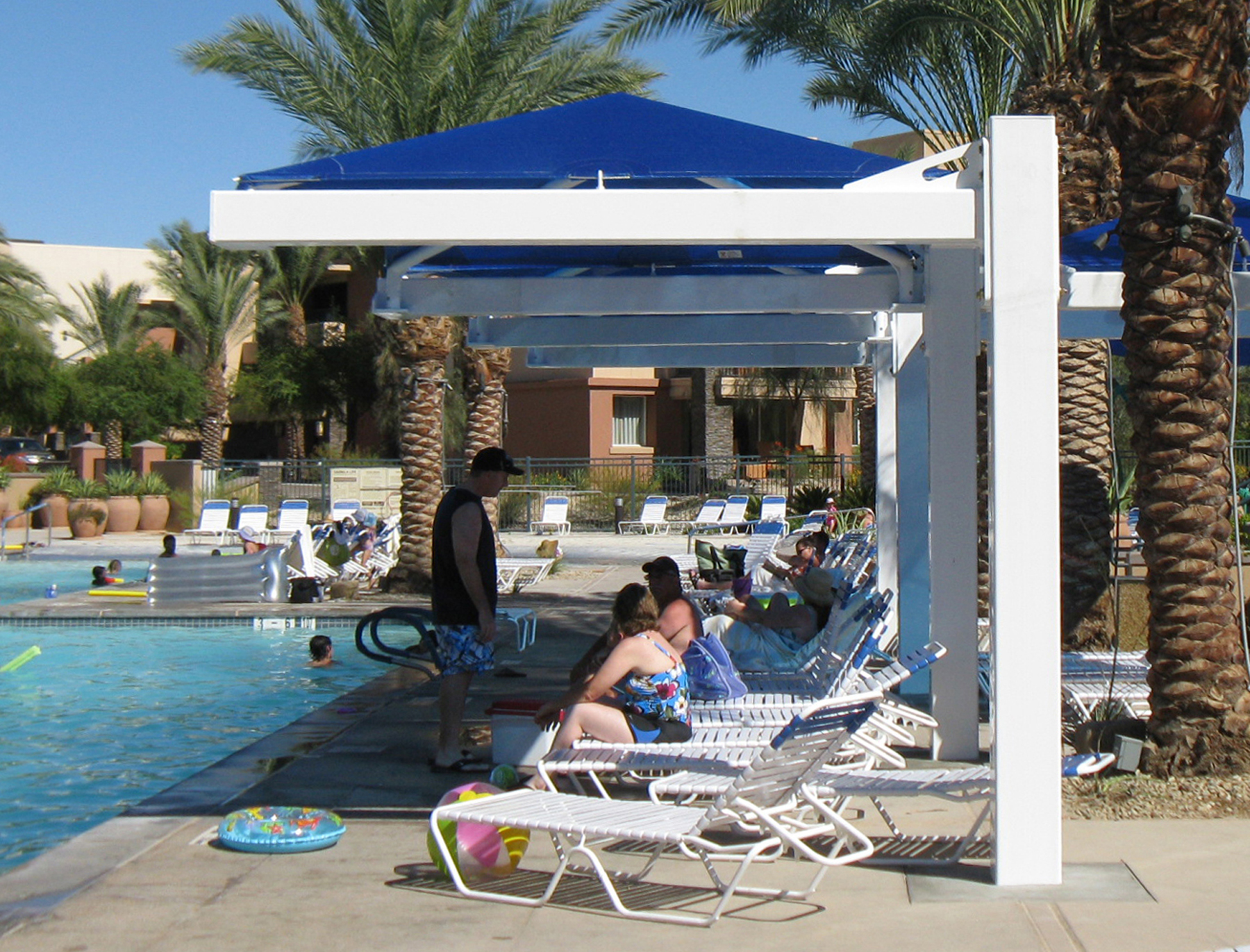 These royal blue and white Joined Single full cantilever shade structures create a poolside focal point at a resort in Palm Springs, California. They measure 17' x 30' x 8'. Our Cantilevered (Canti) structures provide shade for any area where only one side can be attached to the ground. This is an ideal design for pool areas, car washes, driving ranges, etc. Our complete line includes both Full and Semi-Canti structures in both single and double-wide configurations.