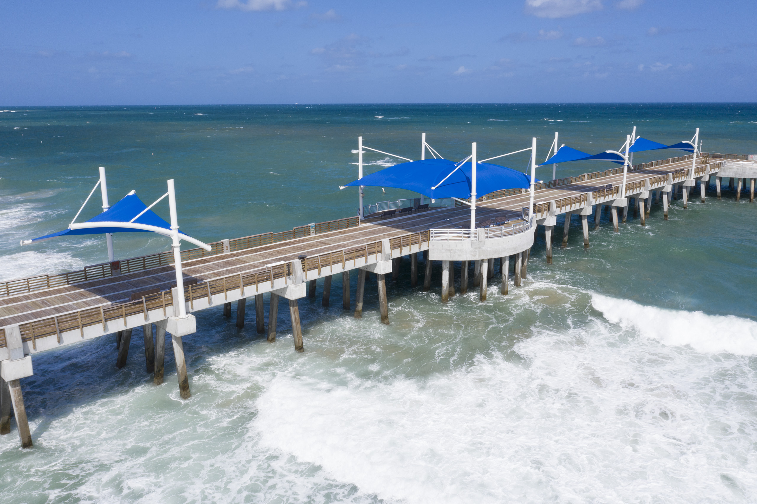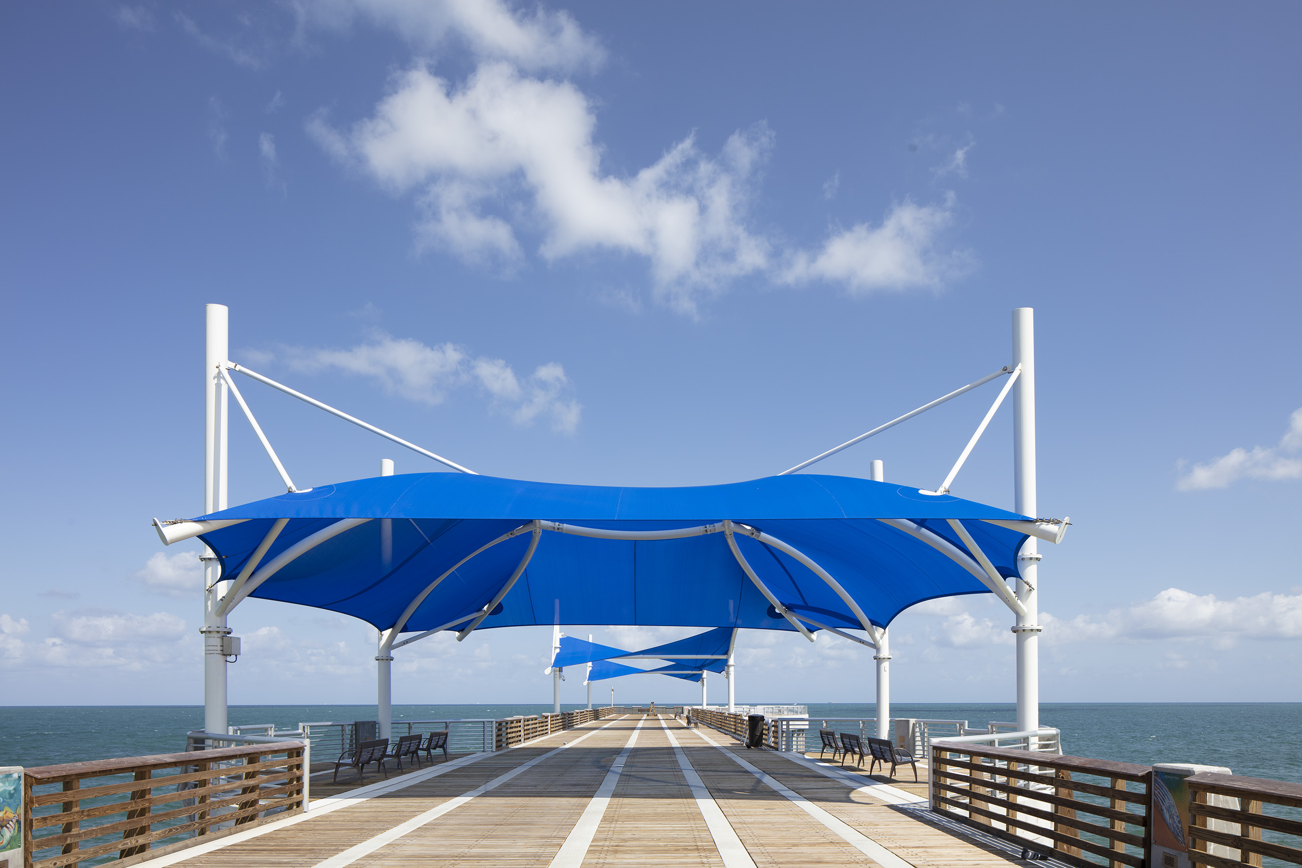 Through a joint effort between three separate municipal departments, this Florida city selected USA SHADE to affix three unique shade structures to their pier that extends over the Atlantic Ocean. Due to their proximity to the sea, these structures were fitted with stainless steel hardware, and the structural steel was hot-dip galvanized and then coated with a two-part wet paint on-site.
