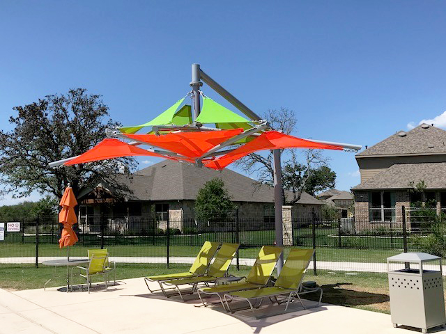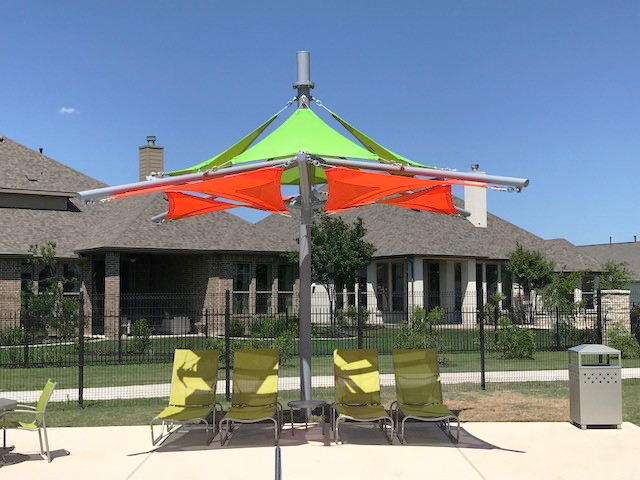 The homeowners within this Central Texas community wanted to add shade to their amenity center but desired a custom look. Providing over 220 square feet of shade, this unique structure is outfitted with Zesty Lime and Orange fabric panels for a vibrant, colorful look.
