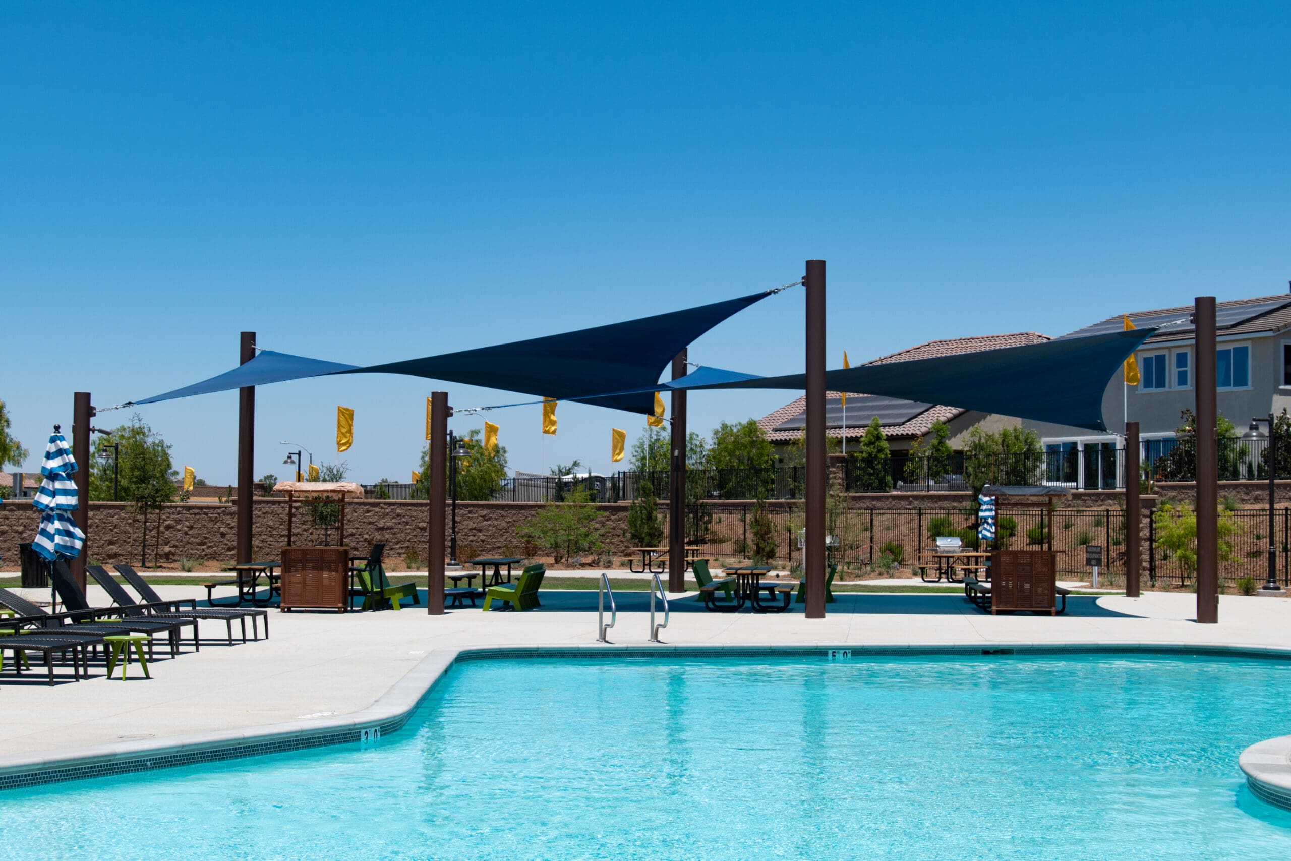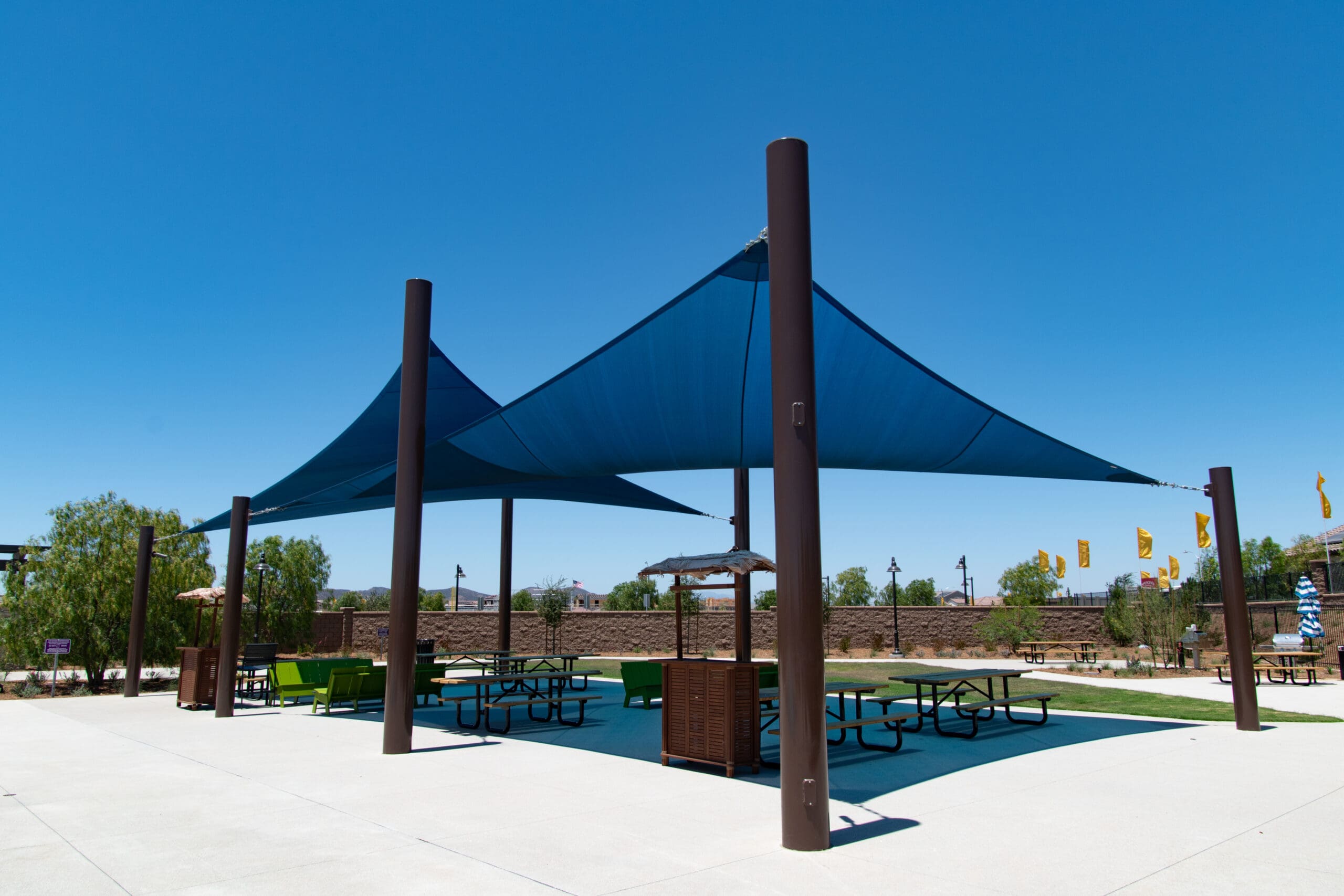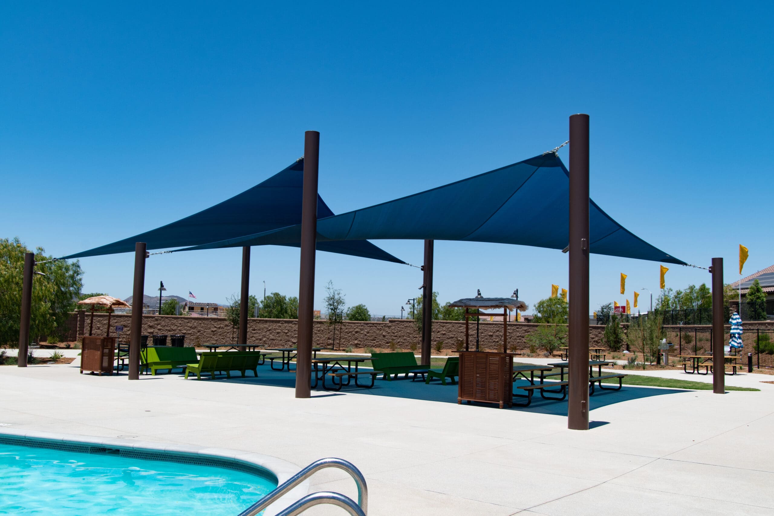 USA SHADE designed, fabricated, and installed these joined, overlapping 4-Point Sails at the resort-style amenity center within this Southern California master-planned community. Providing approximately 1,800 square feet of shade, these "hypar" shade structures offer outstanding aesthetics and a welcome respite from the sun for this outdoor seating area. Integrated lighting enables this area to be used after dark.