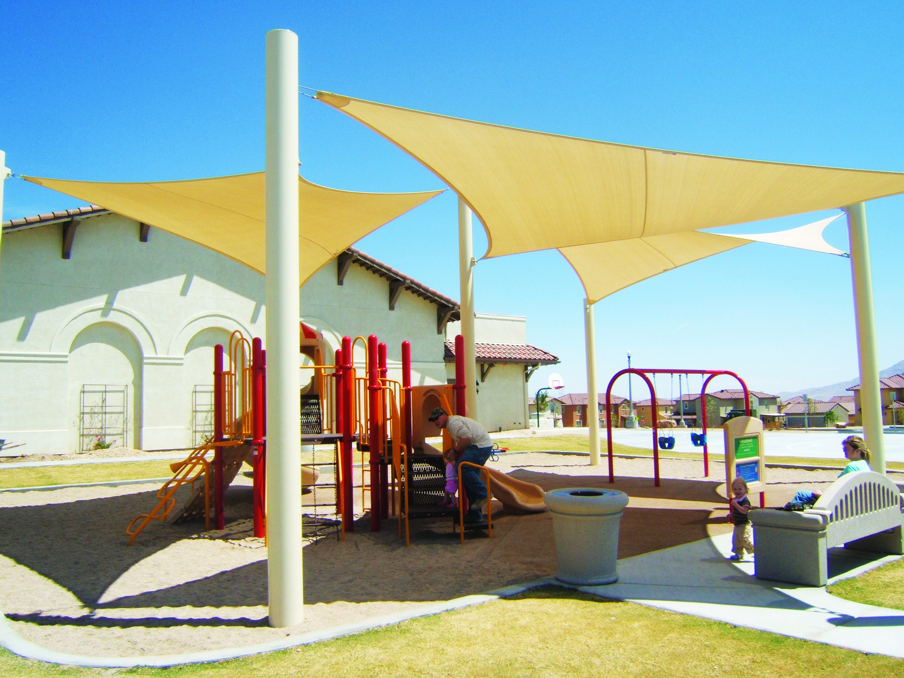 Our 4-Point Hypar Sail structure features columns of varying heights, enabling the fabric to be "formed" into a hyperbolic shape, once installed. Thanks to the high/low hyperbolic shape, this structure can be installed at a particular angle to ensure maximum shade during the hottest months of the year.