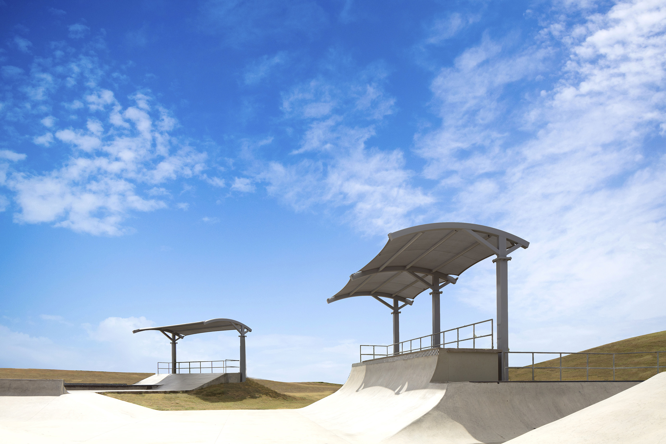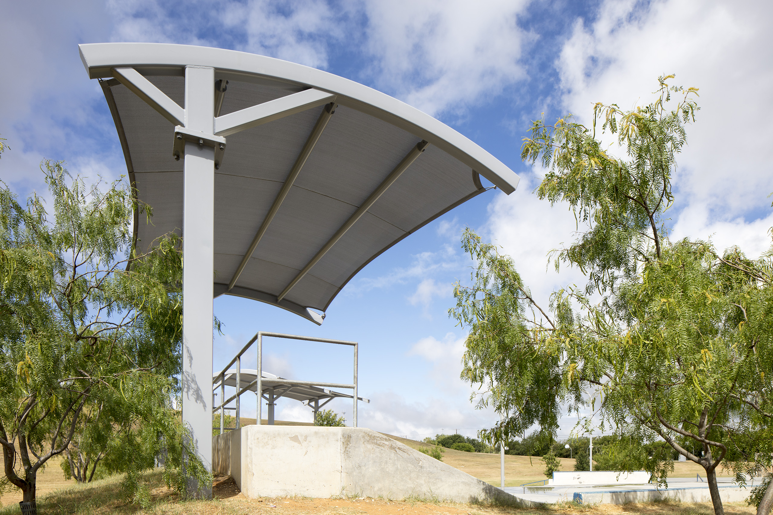 As part of a massive park expansion in this South Texas city, their Parks & Recreation department selected USA SHADE to provide multiple shade structures for the largest skate park in the city. The client decided on our Panorama and Luna structural designs to provide shade over four separate areas around the skate park. Skaters will confirm that having shade available during the hot Texas summer is a must.