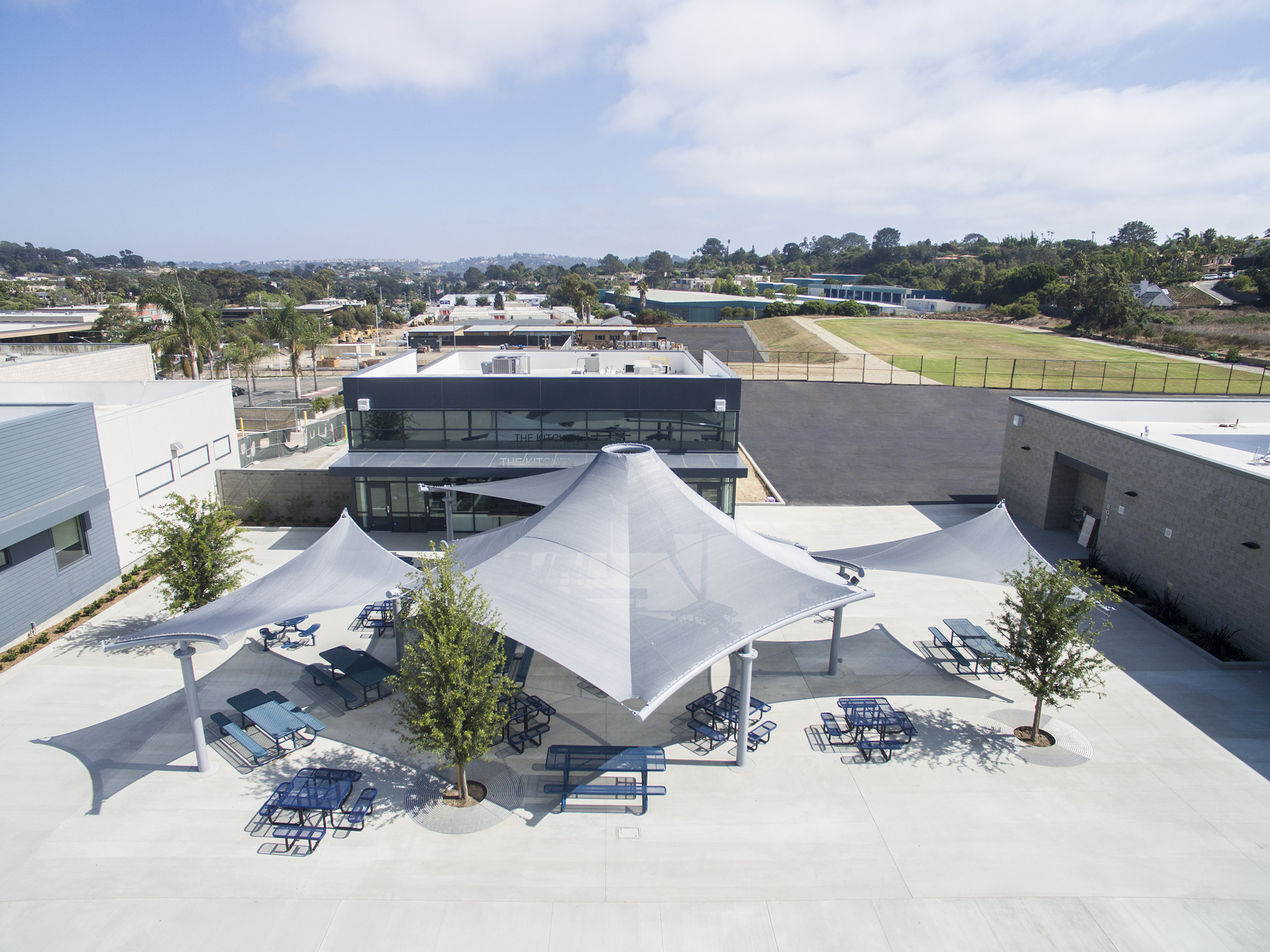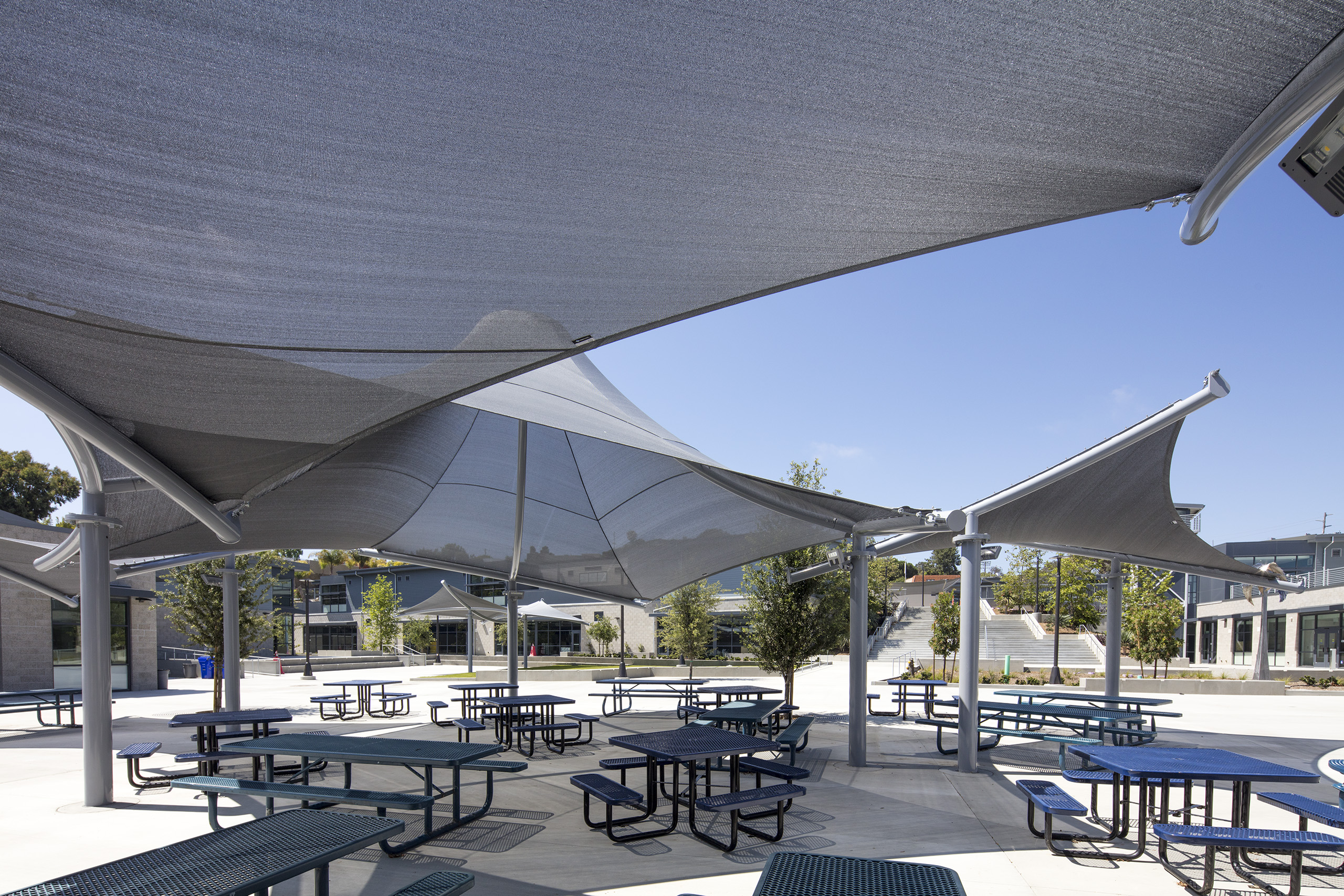 The students at this middle school in Southern California are spending time under some of our latest and most customized shade structures. All DSA-approved, this project features custom two-post, 4-Point Sails, a custom conical structure surrounded by three Orion structures, and an Aquarius structure just steps away. The fabric and steel colors blend perfectly with the school's design.