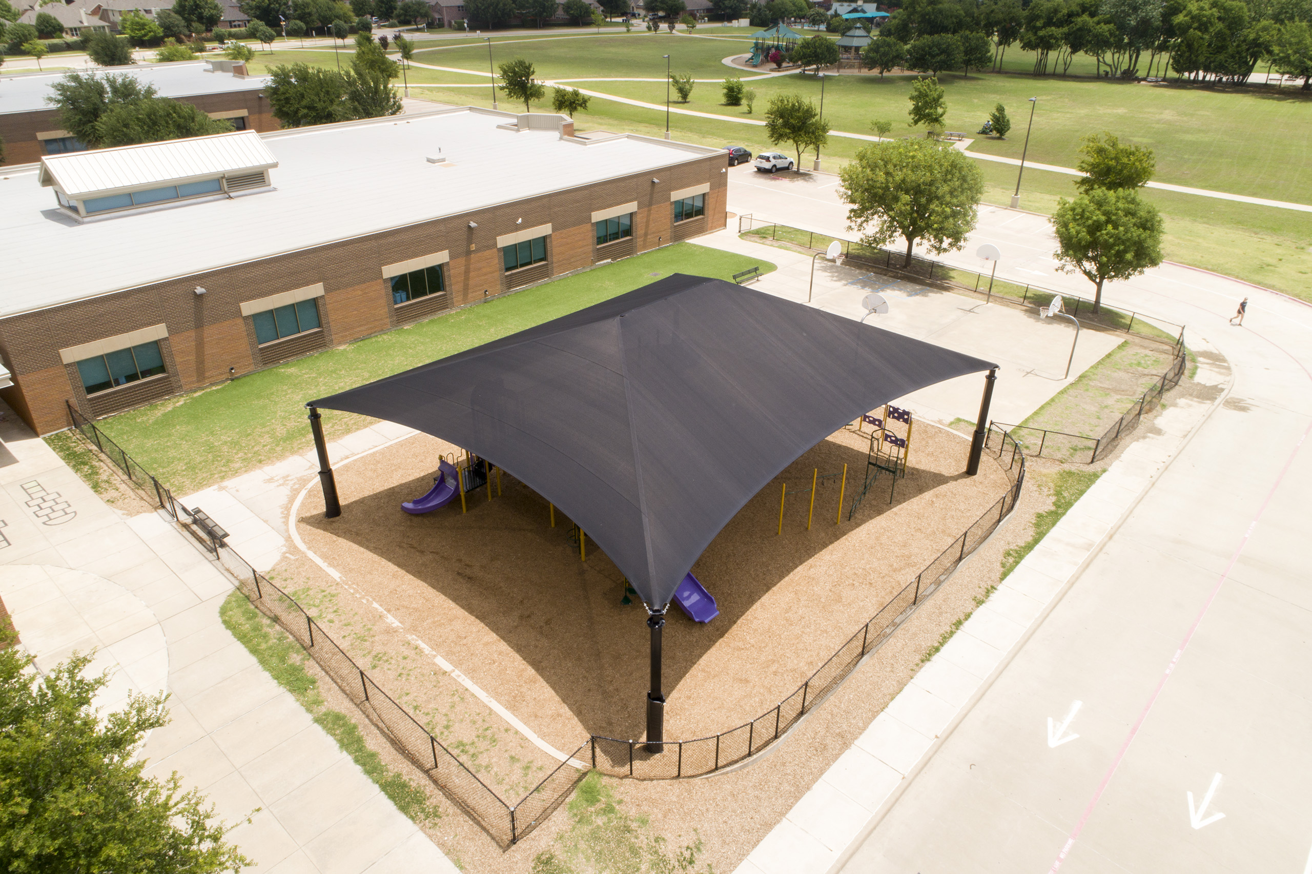 This large 34' x 37' HIP structure provides young students with plenty of shade in play areas during recess. In addition to protecting children from the sun's harmful UV rays, this structure also helps protect the play equipment staged beneath, extending its lifespan.